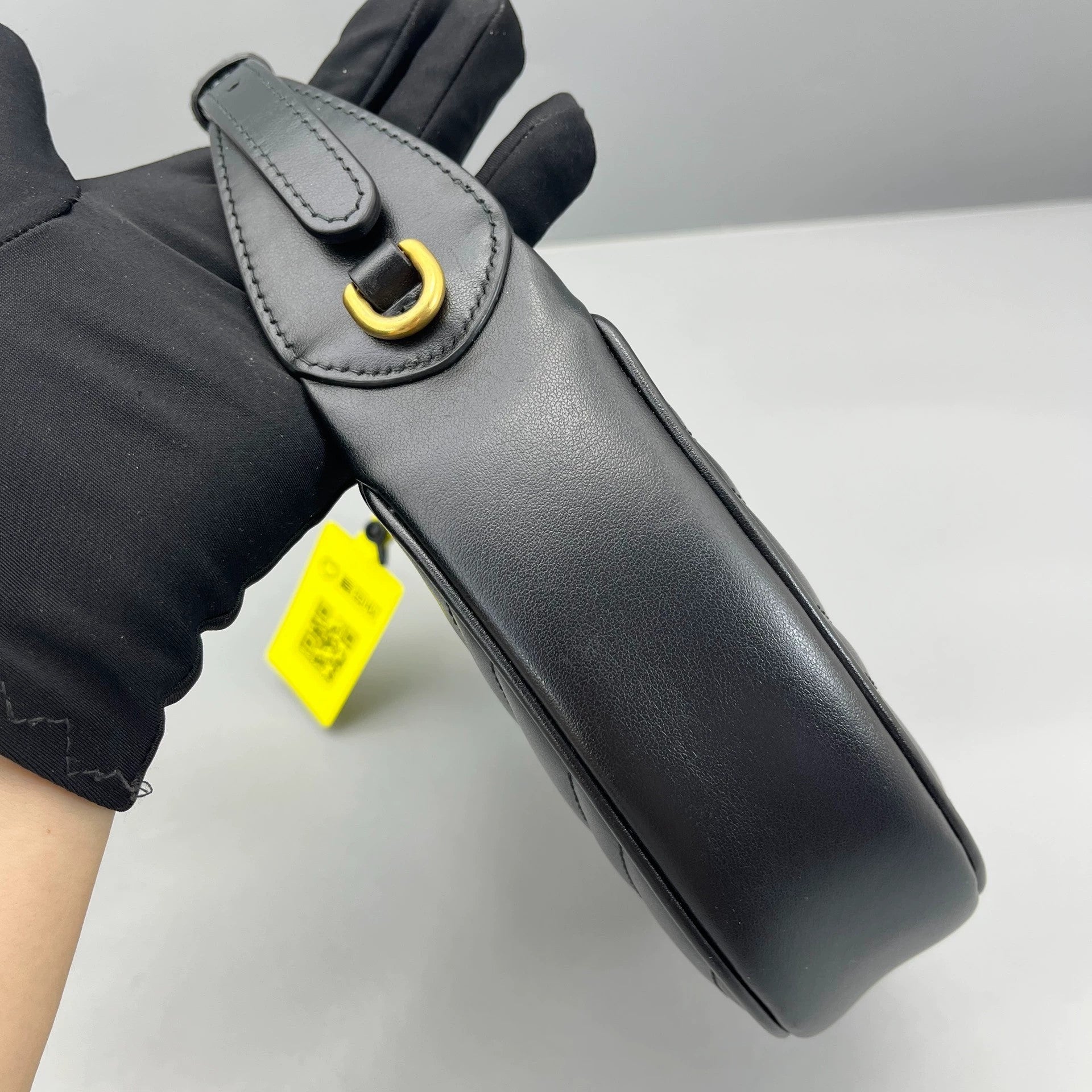This Gucci GG Marmont Half Moon bag is presented in excellent pre-owned condition, rated as 'almost new' (98%). The black quilted leather exterior retains its pristine appearance with no visible signs of significant wear or scuffing. The iconic gold-tone Double G hardware is shiny and free from tarnishing, showing only minimal hairline scratches consistent with very gentle handling. The interior lining is impeccably clean, free of stains or odors. All stitching is intact and robust, and the zipper operates smoothly and securely.