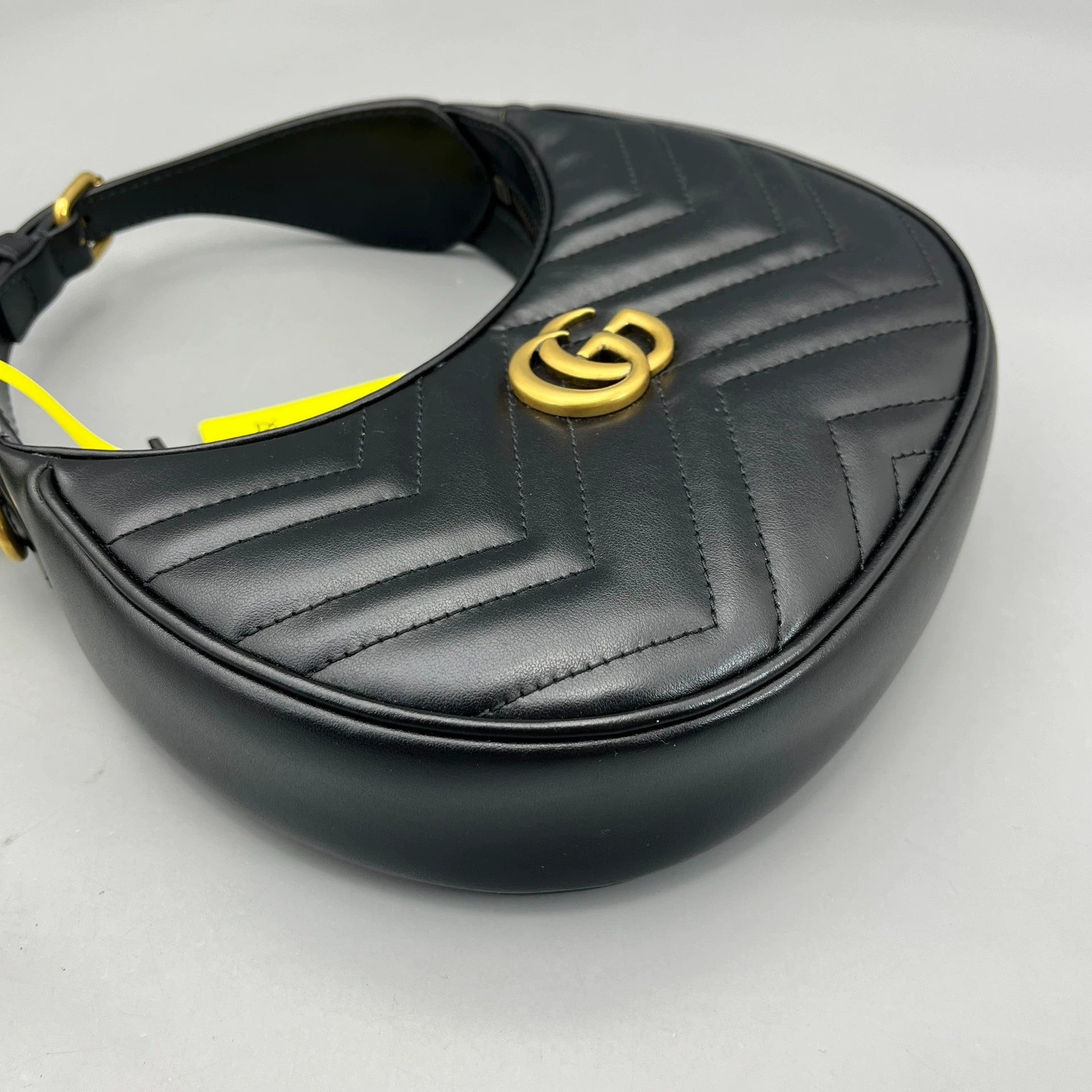 Crafted from luxurious black leather featuring Gucci's signature chevron quilting, the bag boasts a distinctive crescent or half-moon silhouette. A prominent gold-tone Double G emblem adorns the front. The bag includes a flat, adjustable leather shoulder strap, allowing for comfortable wear.