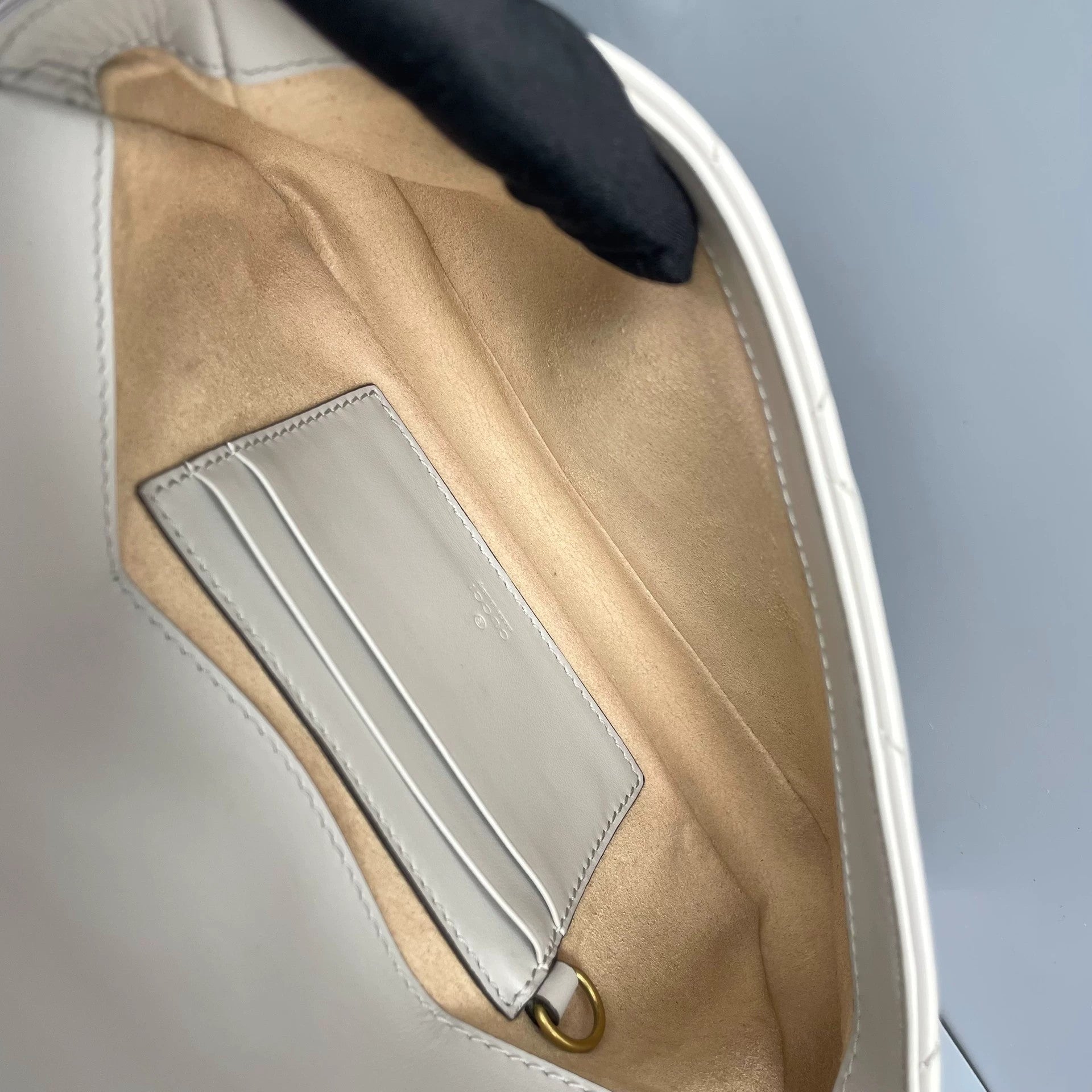 All hardware is rendered in polished gold-tone metal. This includes the interlocking GG emblem on the front flap, the snap closures, and the versatile chain strap. The chain strap attaches via lobster clasps, allowing for ease of use and versatility in carrying.