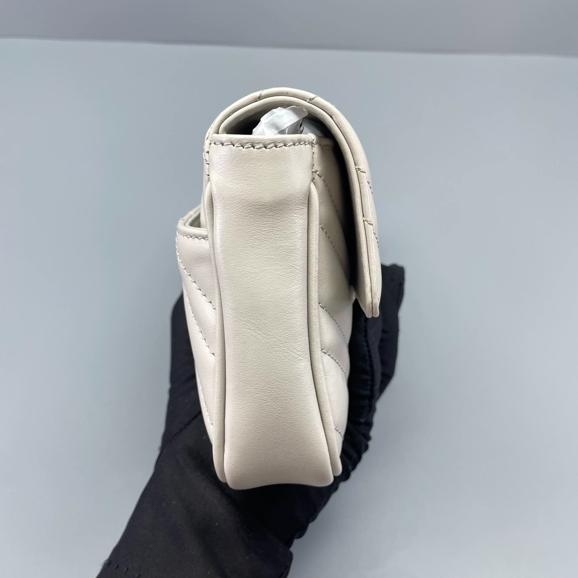 Crafted from soft, supple matelassé leather in a chic beige hue, featuring the signature chevron quilting. The front flap is adorned with the prominent gold-tone interlocking GG logo, which secures the bag with a snap closure. The back of the bag also features chevron quilting and a discreet slip pocket. The overall structure is firm and well-maintained, exhibiting a plumpness to the quilting.