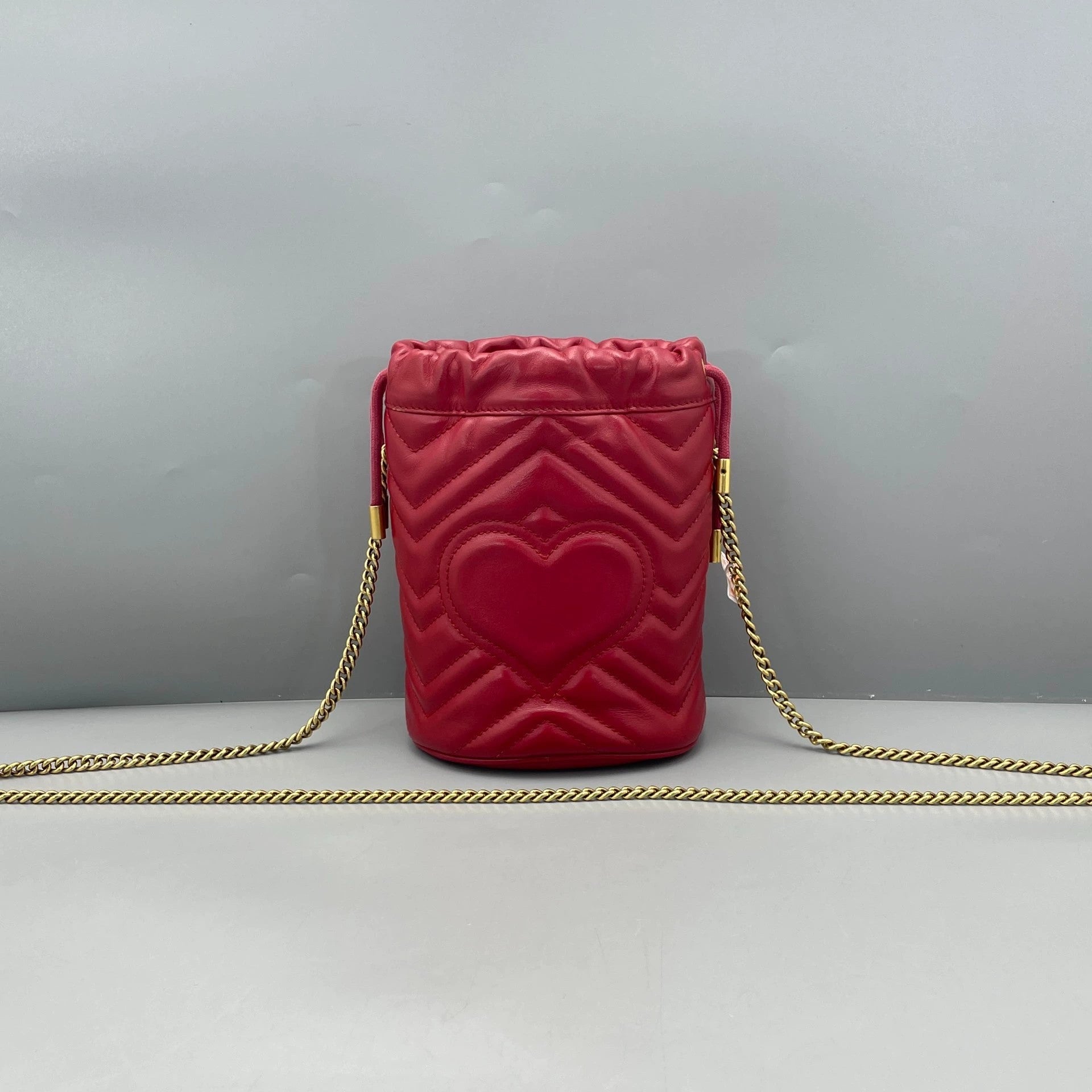 Crafted from supple red leather, featuring the signature GG Marmont chevron quilting that maintains its plumpness. The front is adorned with the iconic gold-tone 'GG' logo, while the back displays a beautifully stitched heart detail. The bag features a drawstring closure at the top, allowing for secure storage. The base is clean and well-maintained.