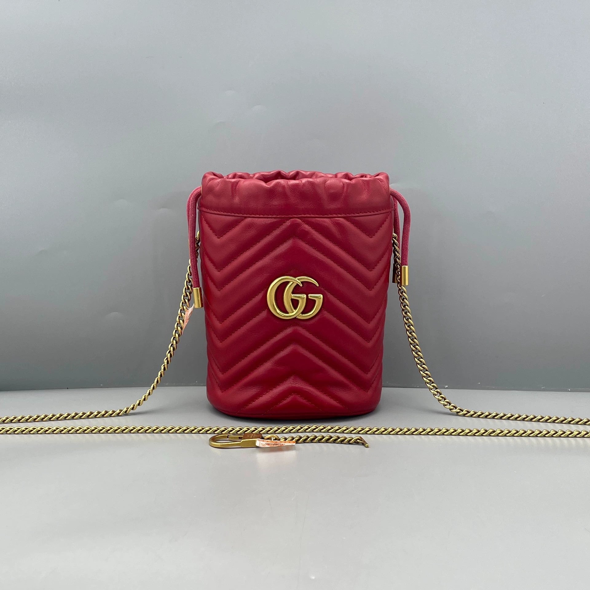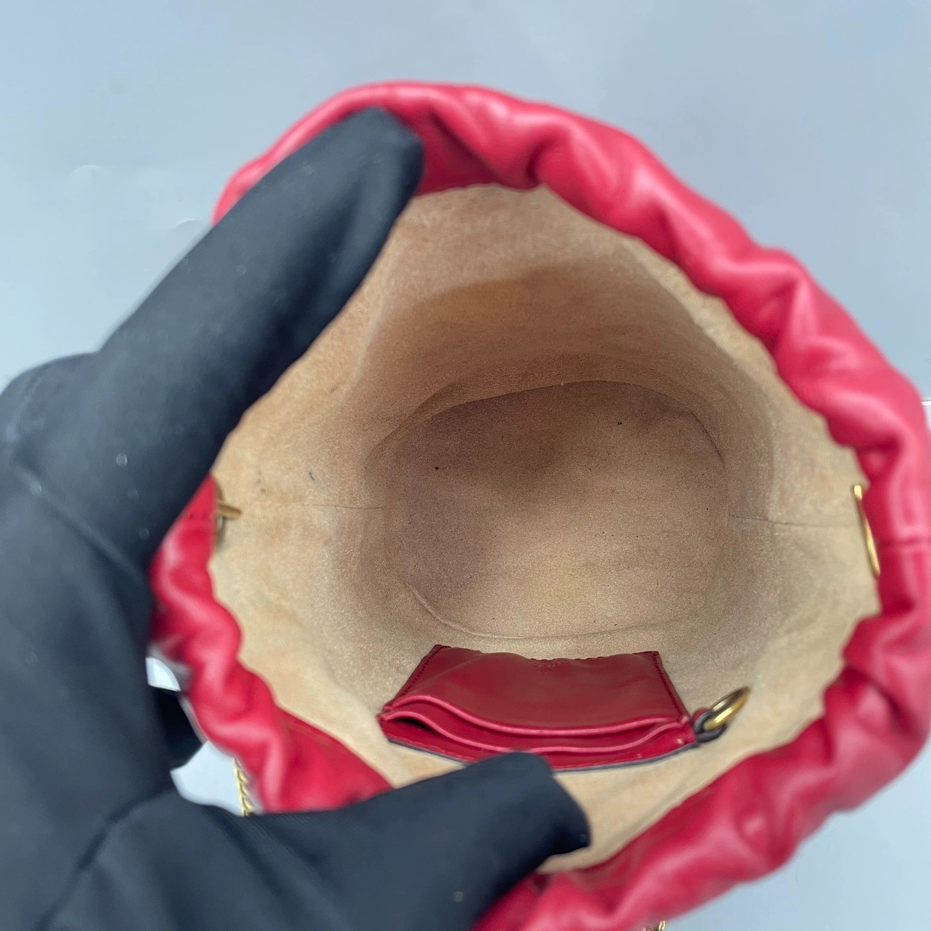 This Gucci GG Marmont Mini Bucket Bag is in excellent pre-owned condition, rated as 97% new. The vibrant red leather exterior shows minimal signs of wear, maintaining its structured shape and puffy chevron quilting. There are no significant scuffs, scratches, or discoloration visible. The gold-tone hardware is bright and shiny with only very faint hairline scratches consistent with gentle handling. The interior is clean with minor signs of use. Overall, the bag presents beautifully, appearing almost new.
