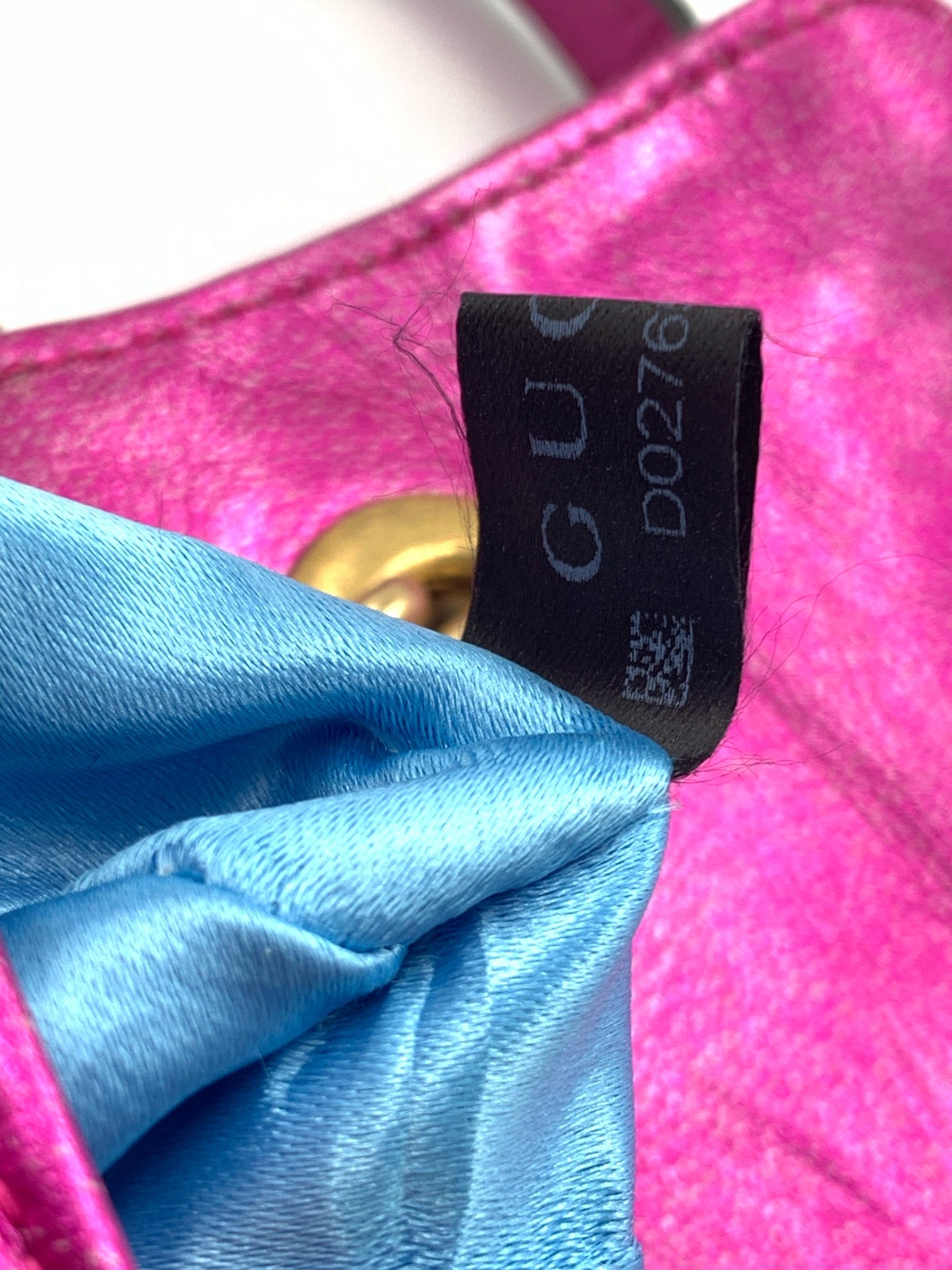 The interior is lined with a vibrant blue satin fabric, providing a striking contrast to the exterior. It features a main compartment with a slip pocket, ideal for organizing essentials. A discreet leather tag with the Gucci logo and a fabric label with 'D0276' are present within the interior, serving as authenticity markers.