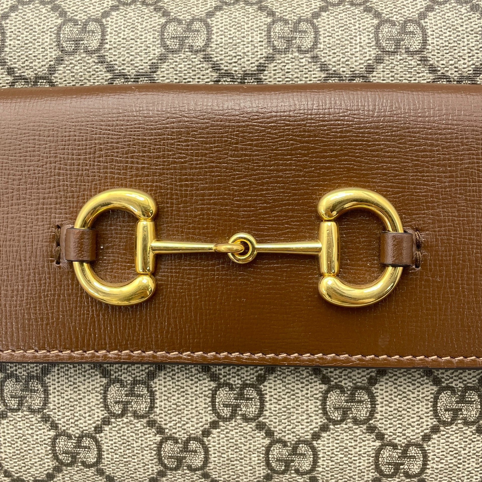The exterior features the signature beige and ebony GG Supreme canvas, accented with rich caramel brown leather trim that defines the edges, sides, and the front flap. The design showcases a rectangular silhouette with a flat base. The prominent gold-tone Horsebit emblem is centrally placed on the front leather flap, which adds a touch of equestrian heritage and sophisticated detailing. The adjustable leather strap allows for versatile wear as a shoulder or crossbody bag.