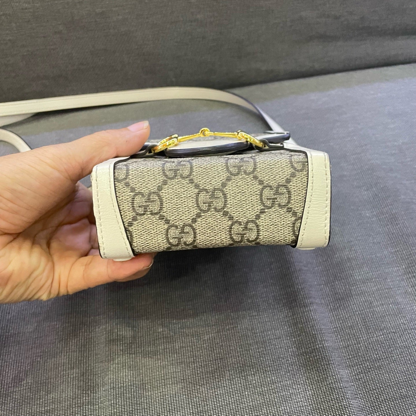 This Gucci Horsebit 1955 Vertical Phone Bag is in excellent pre-owned condition, showing minimal signs of wear. The GG Supreme canvas exterior is pristine, free from any visible scuffs, marks, or discoloration. The contrasting white leather trim remains clean and supple. All gold-tone hardware, including the iconic Horsebit detail, is bright and shiny with no noticeable scratches or tarnishing. The interior is immaculate, with no stains or damage to the microfibre lining. The bag retains its structured shape perfectly.