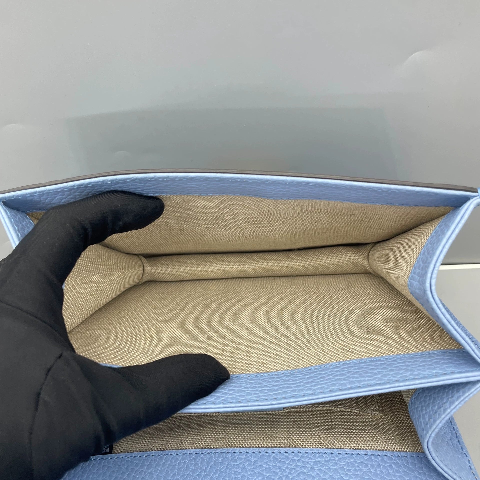 The interior is lined with a natural-toned textile, likely a durable canvas or linen, appearing immaculate and free of any wear. It is designed with multiple compartments, typical of an accordion style, providing organized storage.