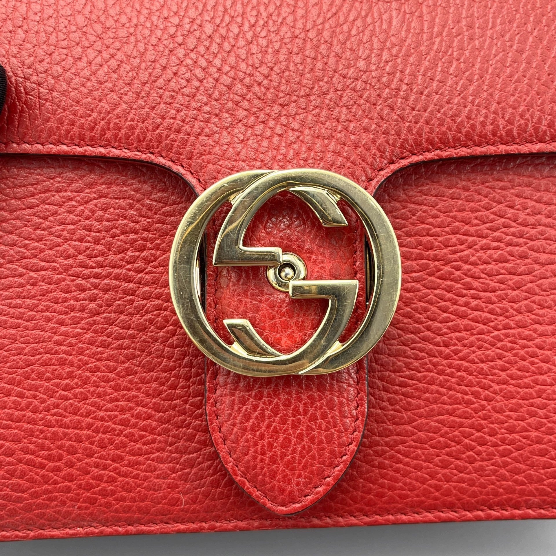 This Gucci Interlocking G Chain Shoulder Bag in red is in very good pre-owned condition, rated at 97% new. It displays only slight signs of use consistent with gentle wear. The exterior leather is vibrant and retains its original texture. The gold-tone hardware remains bright with minimal superficial wear.