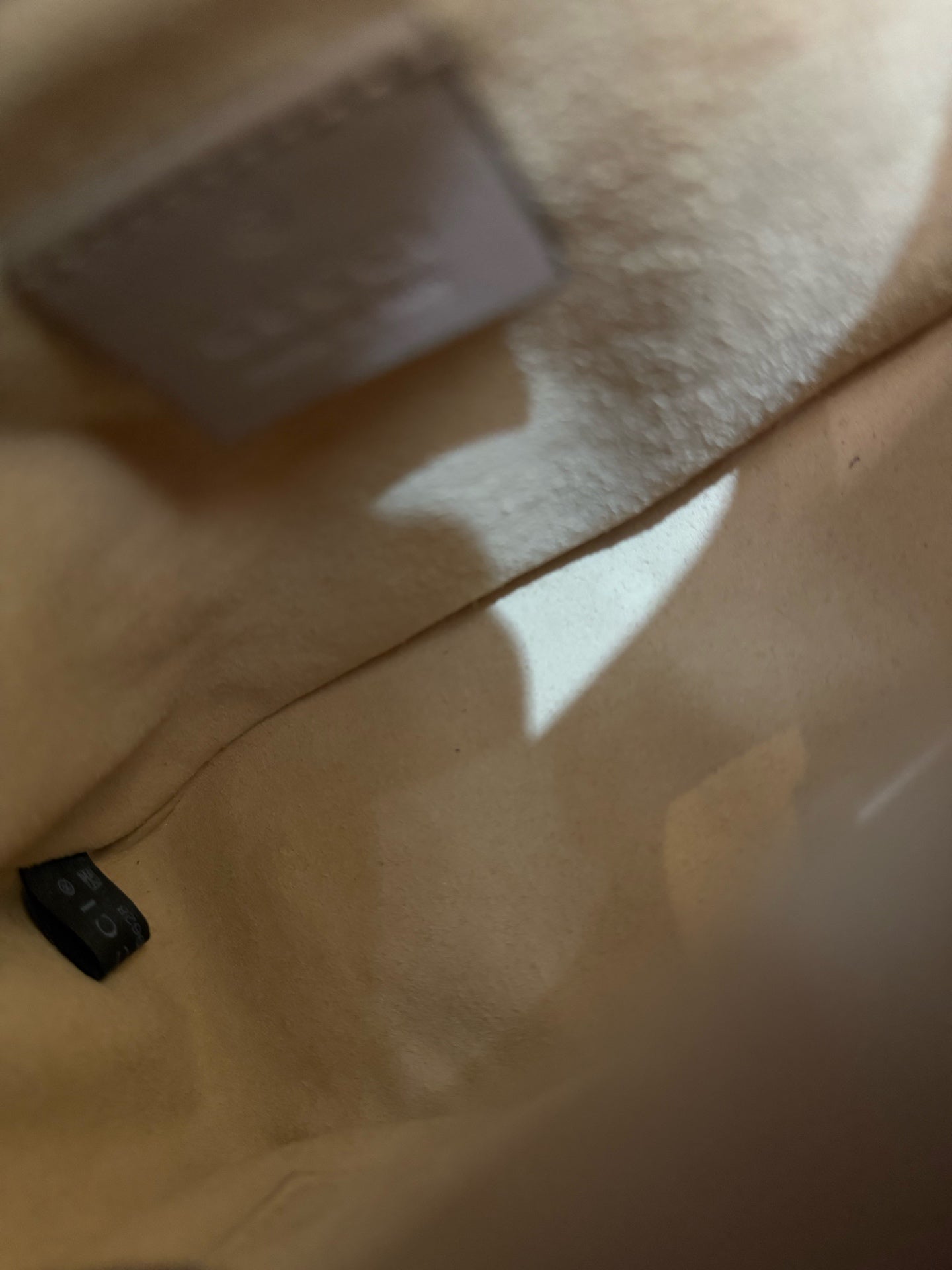 The interior is lined with a tonal microfiber or suede-like material, providing a soft contrast to the exterior. It is remarkably clean and free from stains or odors, featuring a main compartment ideal for essentials. A small leather tag with the Gucci logo is present inside.