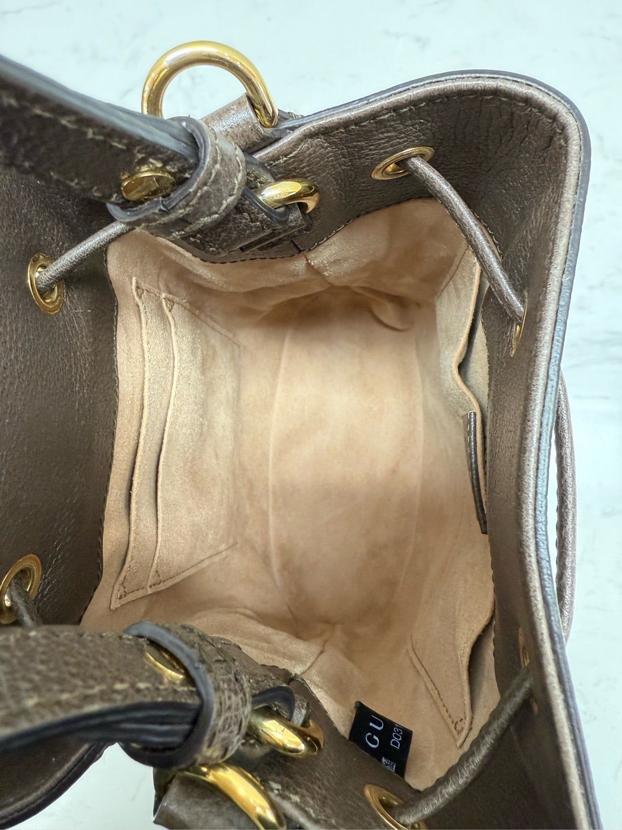 This Gucci Ophidia small bucket bag is in very good pre-owned condition, rated at 95% new, indicating minimal signs of wear consistent with light use. The GG Supreme canvas exterior is well-preserved, showcasing its iconic monogram pattern and the signature red and green Web stripe without notable defects. The dark brown leather trim and details are generally clean, with slight superficial wear that does not detract from the bag's overall appeal. The interior is tidy and free from significant marks or odors. All gold-tone hardware remains shiny and fully functional.