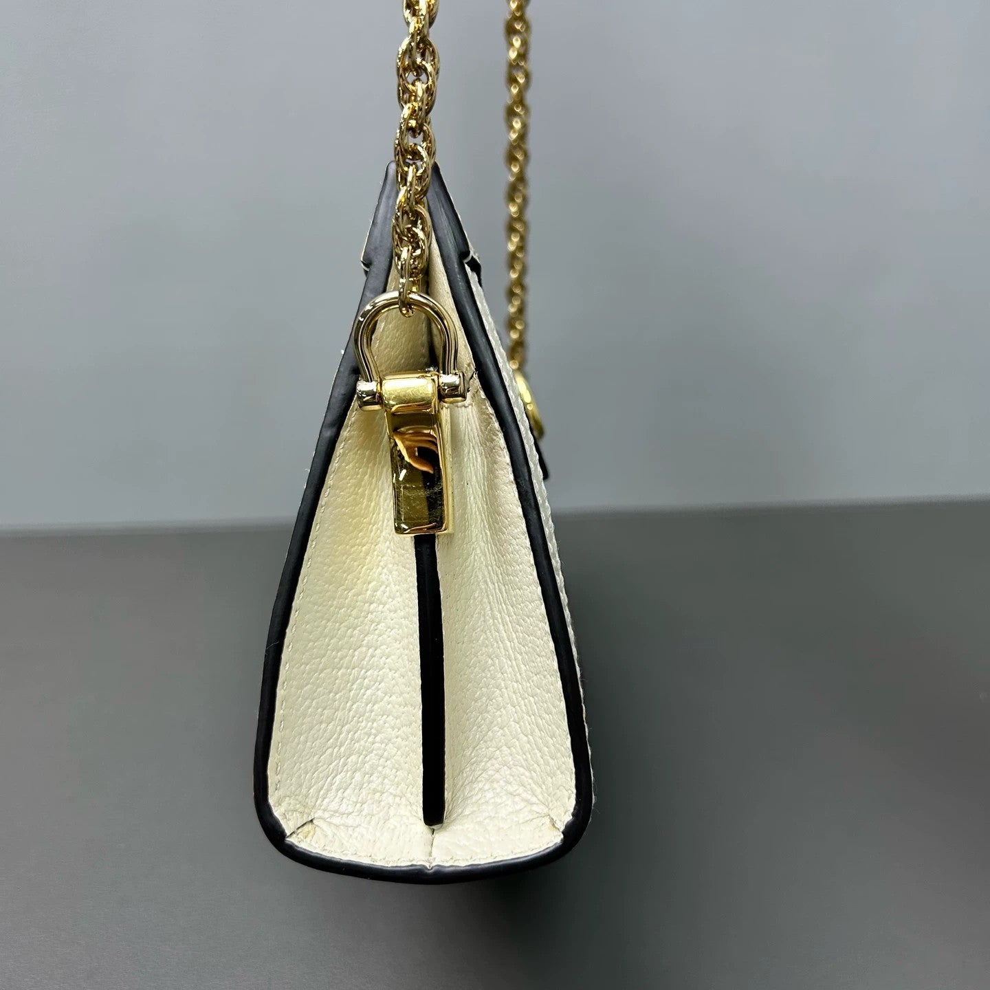 All hardware is crafted from polished gold-tone metal, including the interlocking GG logo closure and the delicate chain strap attachments. The chain strap itself is also gold-tone, appearing bright and functional.