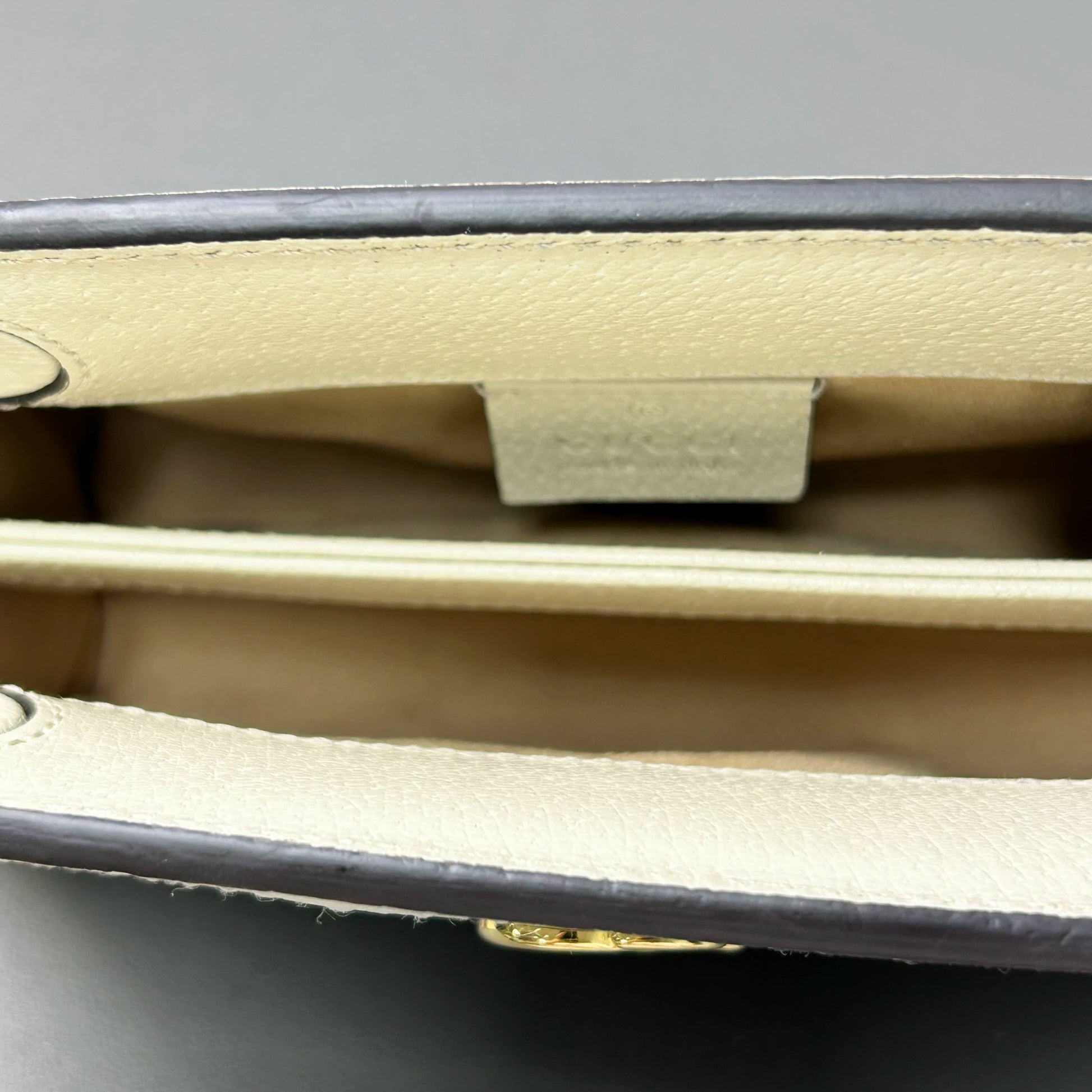 This Gucci Ophidia Mini Clip Bag is in good pre-owned condition, showing slight signs of use consistent with gentle wear. The GG Supreme canvas maintains its integrity with minimal visible marks. The pebbled leather trim is in good shape with minor wear. The iconic Web stripe is vibrant, and the gold-tone hardware remains shiny with some faint surface scratches. The interior is clean with light signs of use.