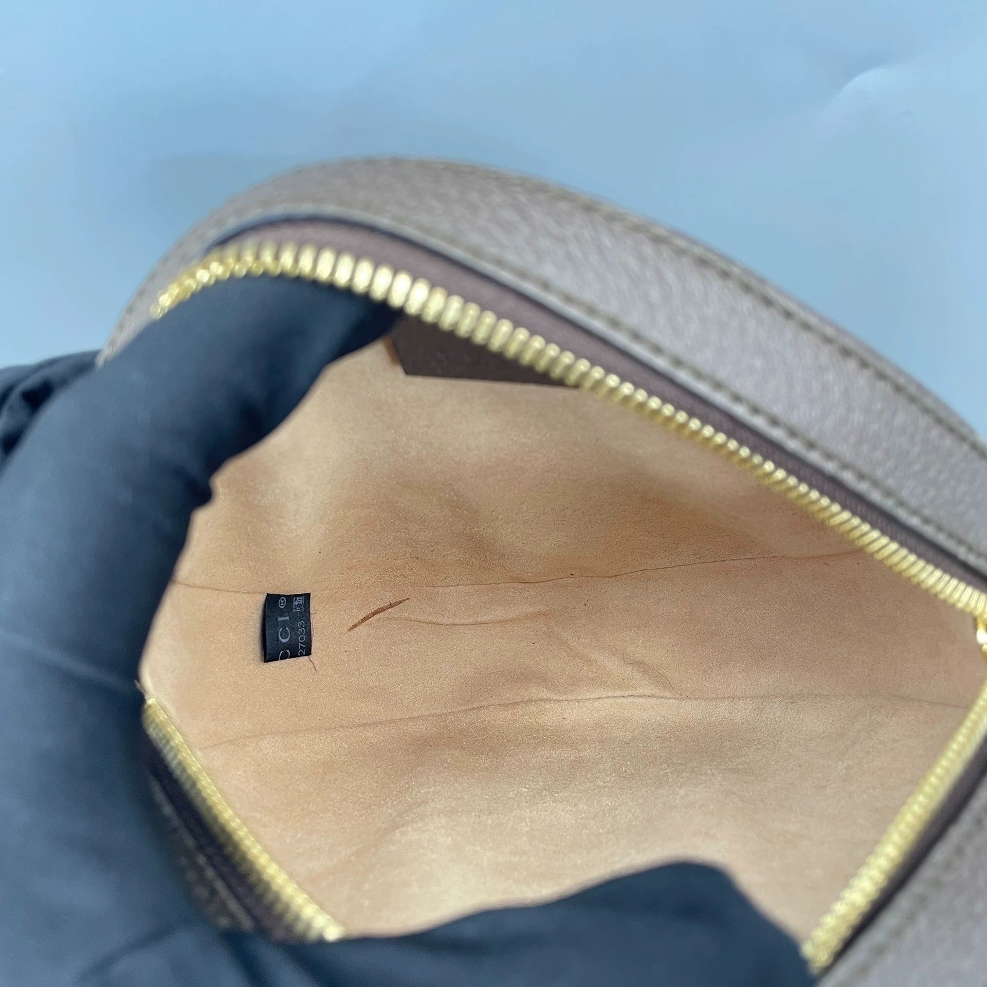 Features polished gold-tone hardware throughout, including the prominent Double G emblem on the front flap detail, a smooth-gliding top zipper closure with a branded pull, and the D-rings that connect the shoulder strap. The hardware shows a bright luster with minor signs of handling.