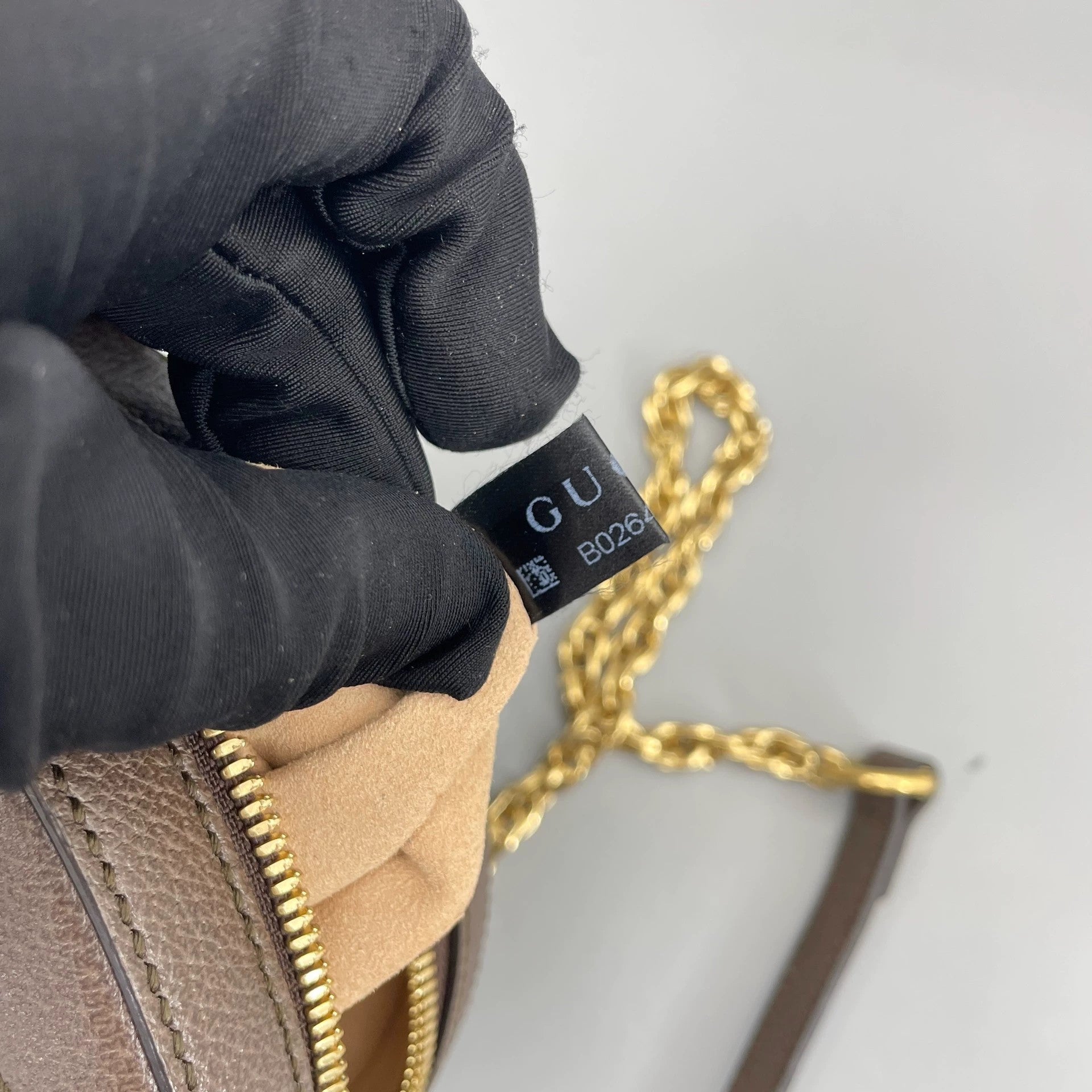 This Gucci Ophidia Round Mini Shoulder Bag is presented in excellent pre-owned condition, rated at 97% new. The GG Supreme canvas exterior, featuring the iconic interlocking GG monogram, along with its ebony brown leather trim, exhibits minimal signs of wear. The distinctive green and red Web stripe running vertically across the front remains vibrant and well-preserved. The polished gold-tone hardware, including the prominent Double G logo and the top zipper pull, appears bright with only very faint hairline scratches consistent with gentle use. The interior is notably clean, showing no visible stains or damage. The combination chain and leather shoulder strap is intact and in great condition.