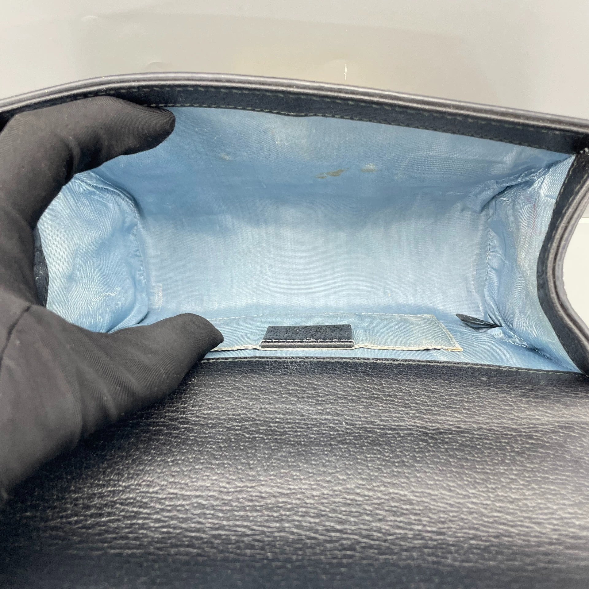 The interior is lined with a contrasting light blue fabric, providing a pop of color. It consists of a single main compartment. A leather tag inside bears the brand's identification, including the serial code. Some light discoloration and minor marks are present on the fabric lining.