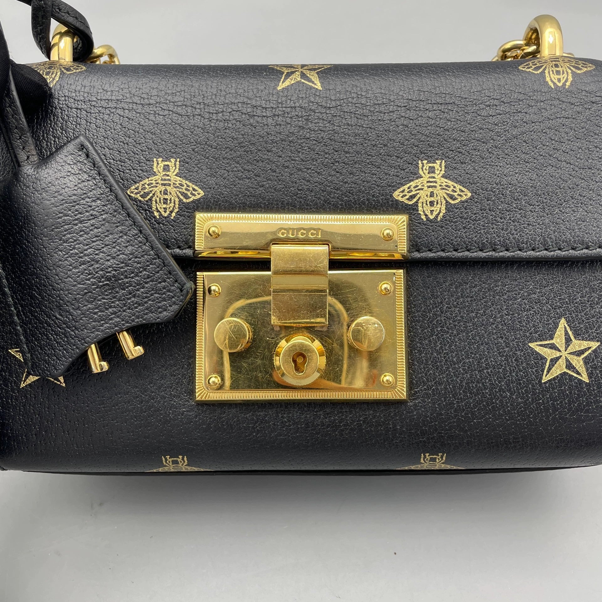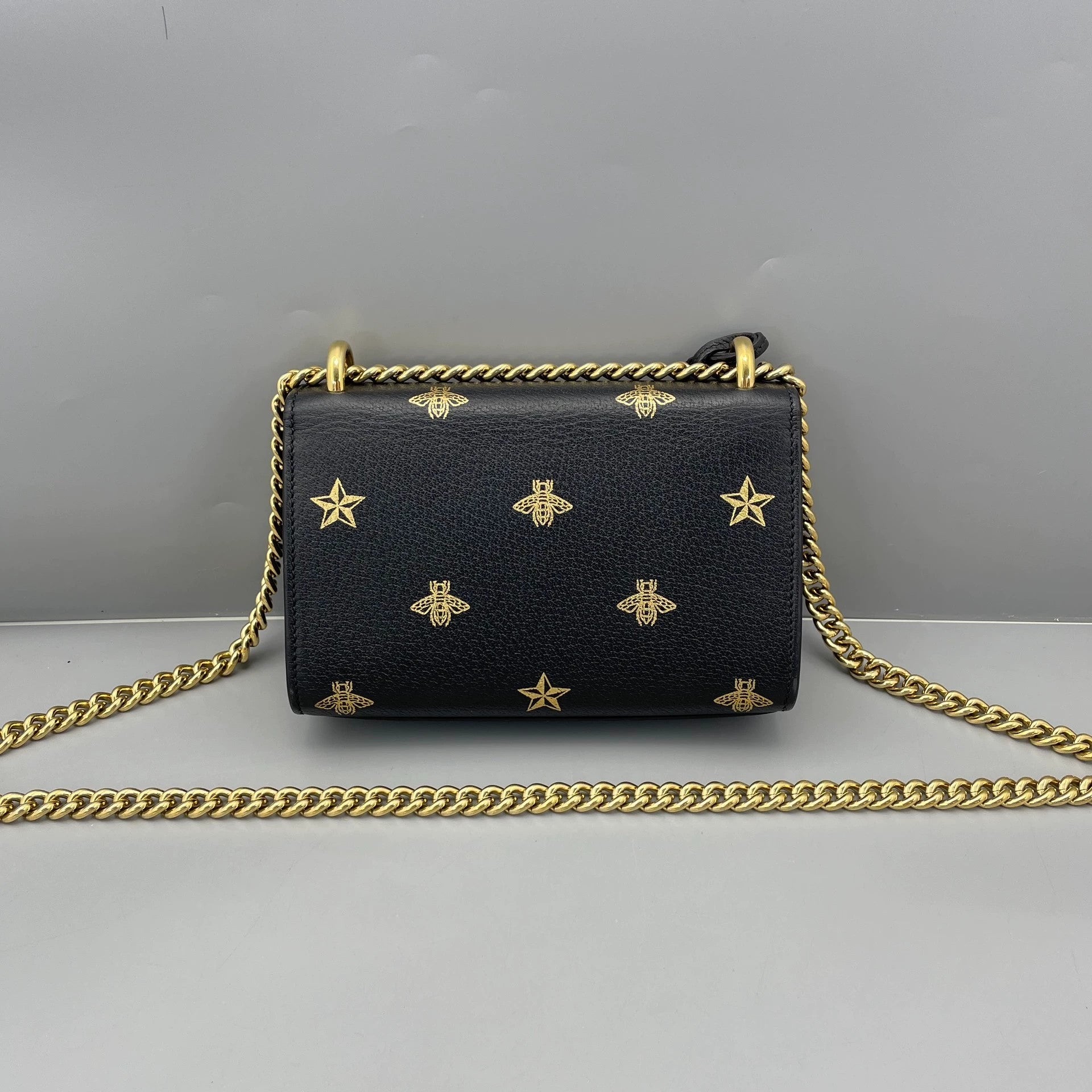 The distinctive padlock closure, inspired by Gucci's vintage luggage designs, coupled with the whimsical gold bee and star motifs, makes this bag a unique and recognizable piece from the brand. The versatile chain strap allows for multiple carrying options.