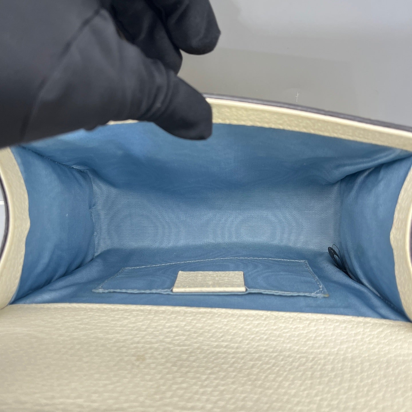 This Gucci Padlock Mini bag is in very good pre-owned condition, maintaining a structured silhouette. The white grained leather exterior shows minimal signs of wear. The gold-tone hardware, including the padlock closure, remains shiny with only slight hairline scratches consistent with gentle use. The interior is clean with no visible stains or damage.