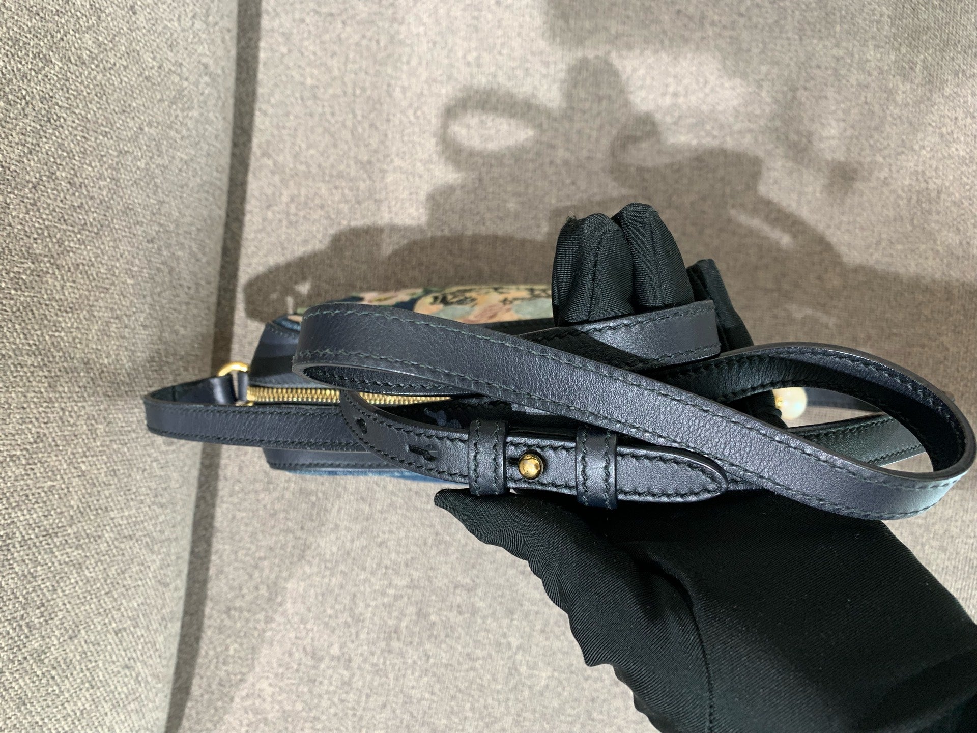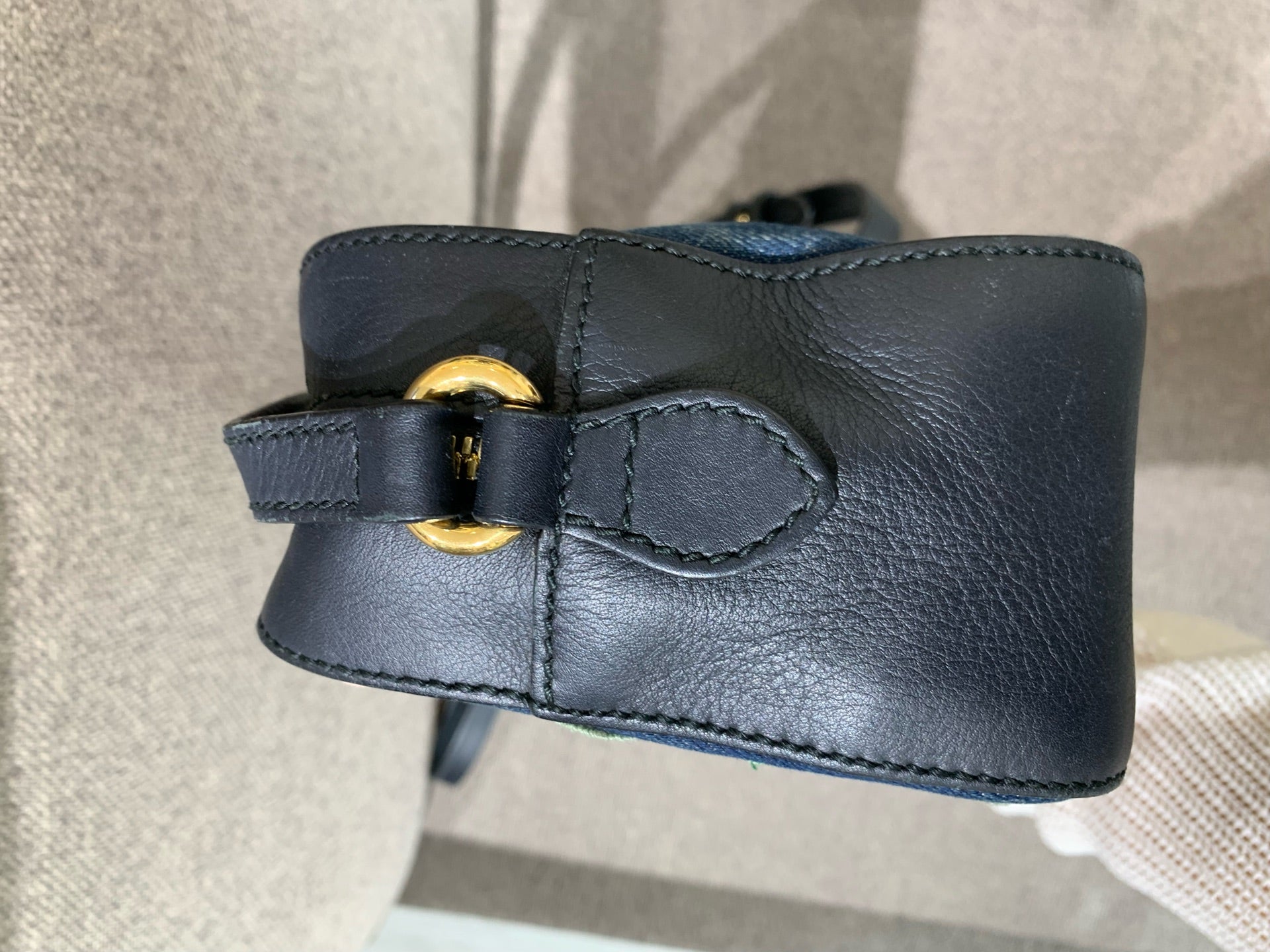 This Gucci Tiger Floral Embroidered Camera Bag is in good pre-owned condition. The exterior denim shows minor fading consistent with gentle use but no significant wear or damage. The leather trim and strap are well-preserved with light creasing but no major scuffs. The gold-tone hardware remains bright with minimal signs of scratching. The interior canvas lining shows some visible discoloration and marks, particularly on the bottom, indicating previous use. Overall, the bag retains its structural integrity and aesthetic appeal.