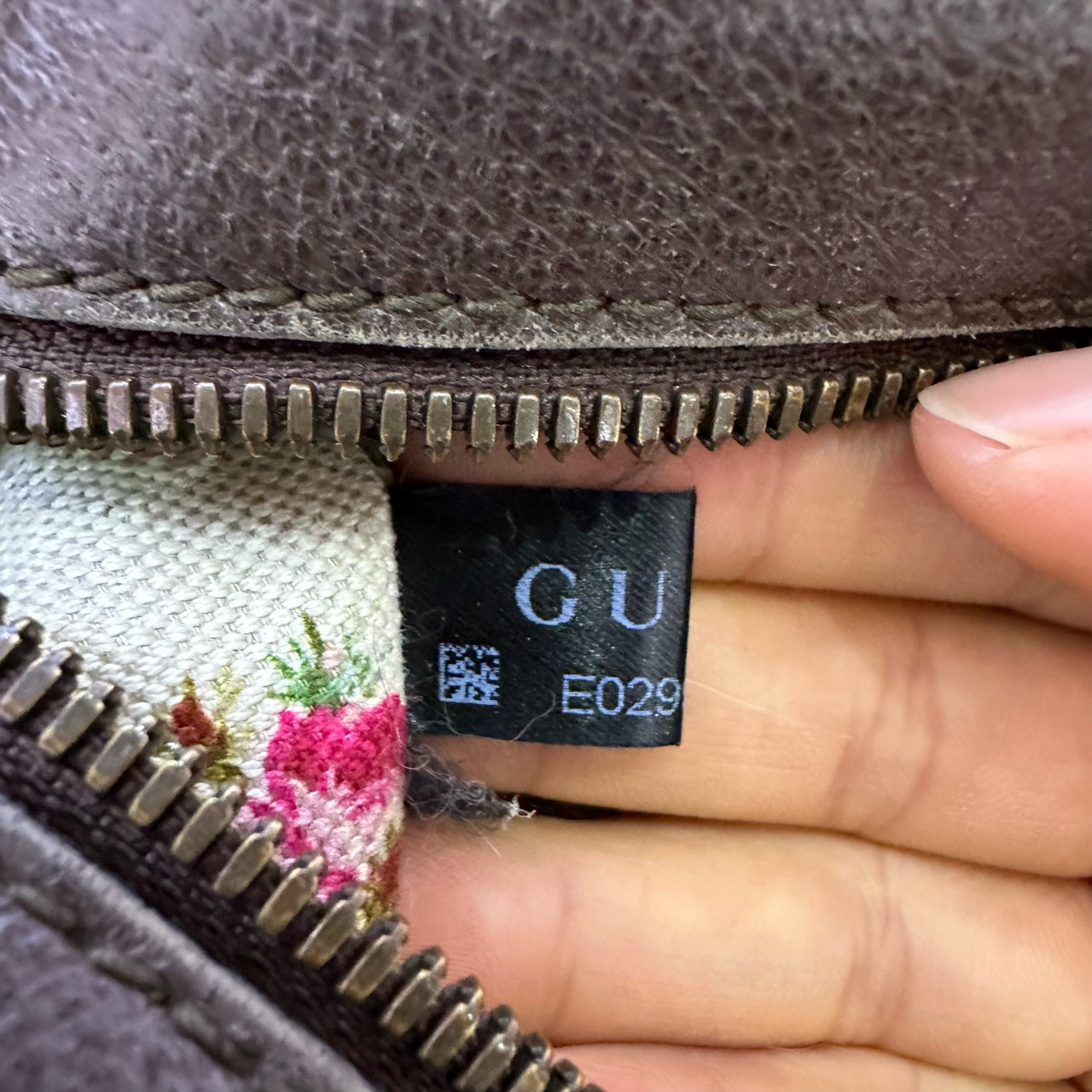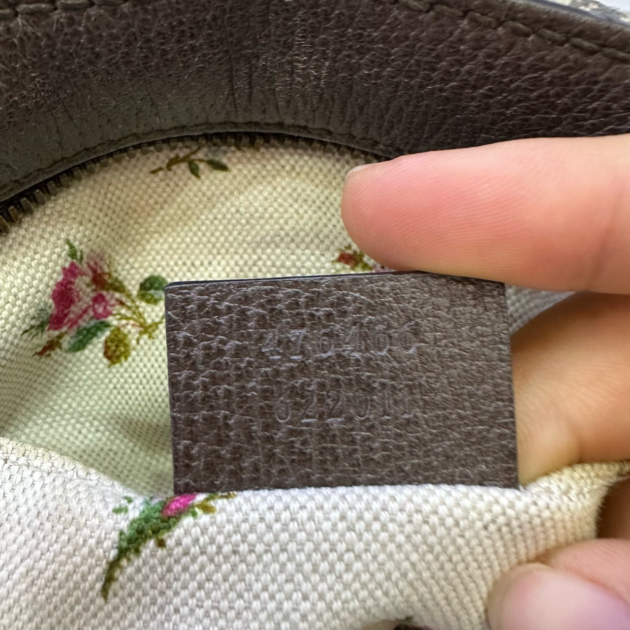 The interior is lined with a unique and vibrant floral-print textile, providing a cheerful contrast to the exterior. It offers a single main compartment, ideal for essentials, with a flat leather authenticity tag featuring serial codes.