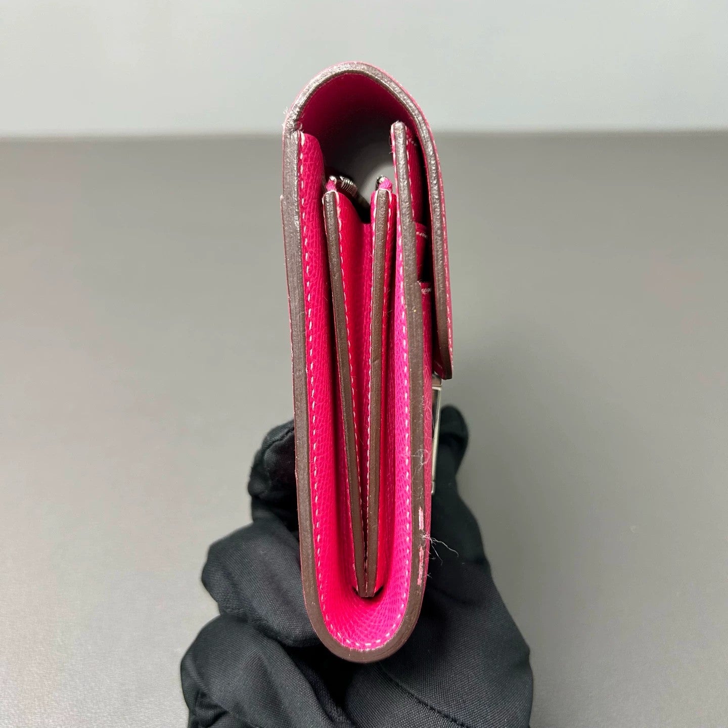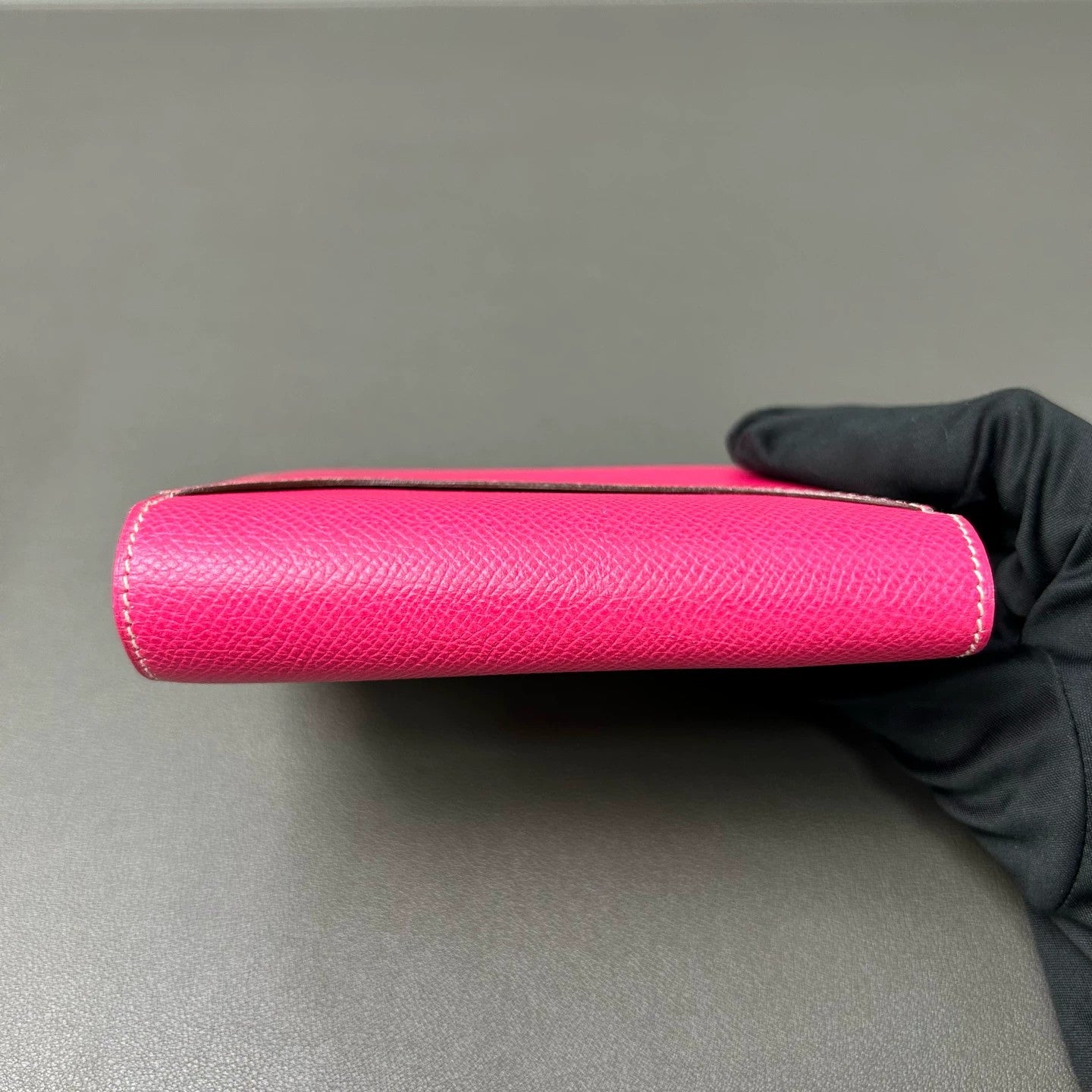 This Hermès Constance Compact Wallet is in very good pre-owned condition, showing slight signs of use consistent with gentle handling. The vibrant Candy Pink Epsom leather maintains its structured form and crisp grain. The palladium-plated H-clasp closure functions perfectly, with only minor hairline scratches visible upon close inspection. The interior is clean with minimal signs of wear. The overall integrity of the wallet, including stitching and edges, remains excellent.