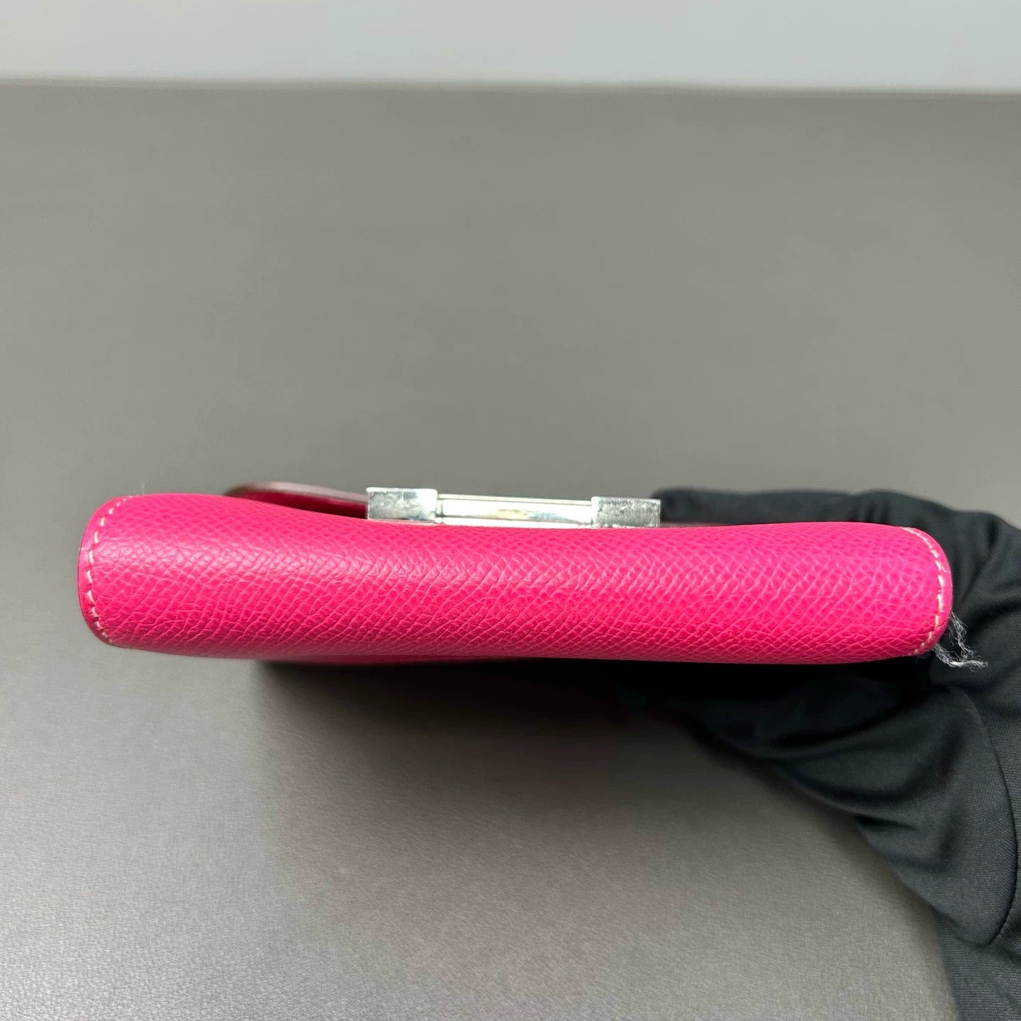The signature H-clasp is crafted from polished palladium-plated metal, providing a sleek, silvery contrast to the vivid pink leather. The clasp mechanism operates smoothly and securely. The interior zipper for the coin compartment also features a palladium-toned pull.