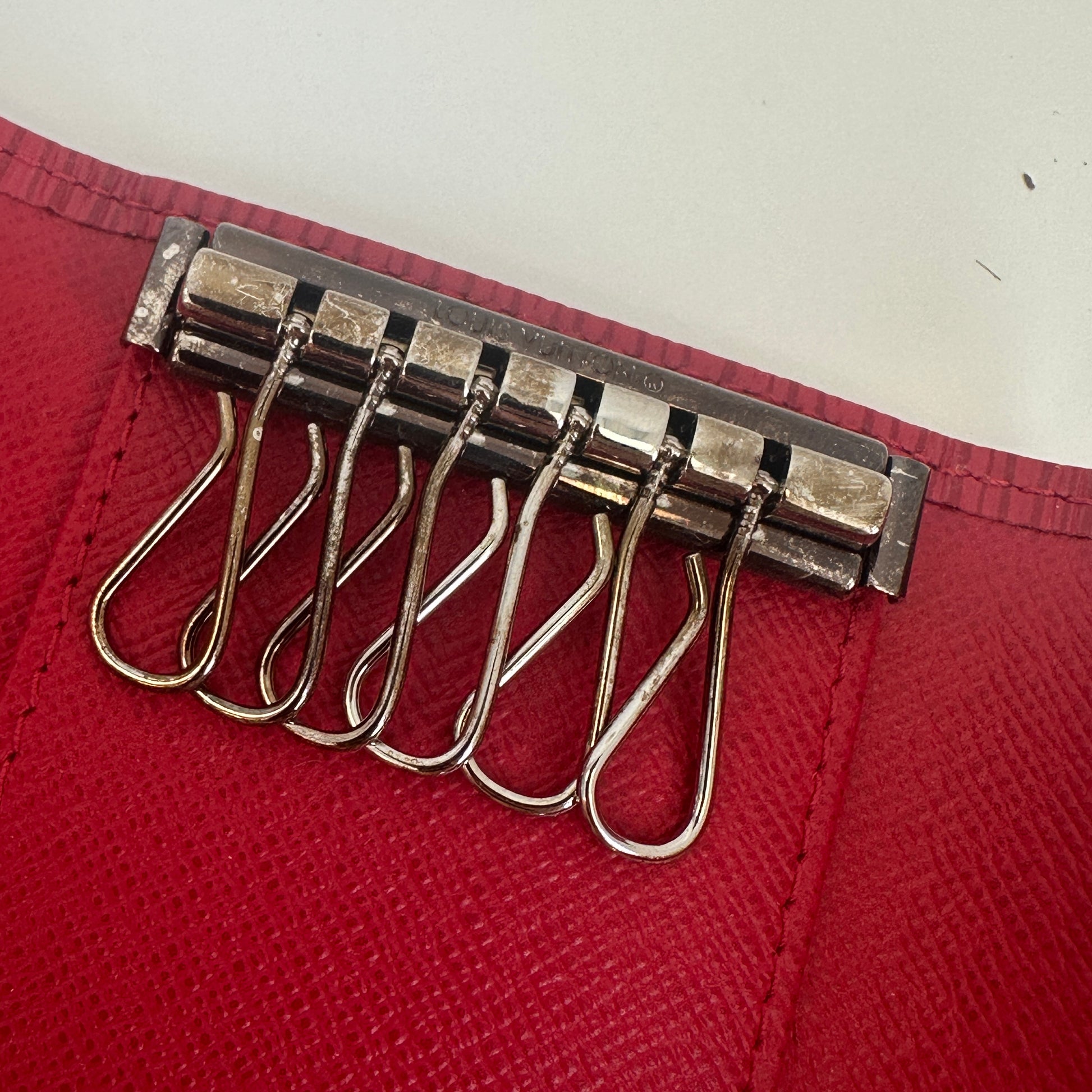 This Louis Vuitton 6-Key Holder in vibrant red Epi leather is in very good pre-owned condition. The exterior leather maintains its distinctive textured grain and rich color with minimal signs of wear. The edges are well-preserved. The interior is clean with no significant marks or scuffs. The silver-tone hardware for both the snap closure and the six key hooks shows minor surface scratches consistent with gentle use but remains fully functional.
