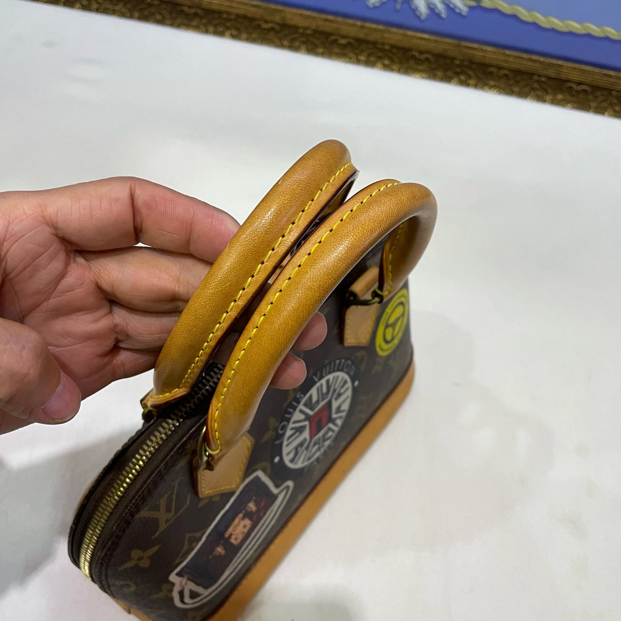 This Louis Vuitton Alma BB Limited Edition with Badges is in very good pre-owned condition, rated at 97%. The iconic Monogram coated canvas exterior remains vibrant with clear patterns and is adorned with various playful, limited edition badges that are well-preserved. The natural Vachetta leather trim and rolled top handles show a beautiful honey patina, consistent with gentle use, along with minor darkening and some very light surface wear. The protective golden brass base studs show minimal signs of wear. The gold-tone hardware, including the zipper, is bright and functional, with only faint hairline scratches. The interior lining is clean with no significant marks or odors. The overall structure of the bag is well-maintained.
