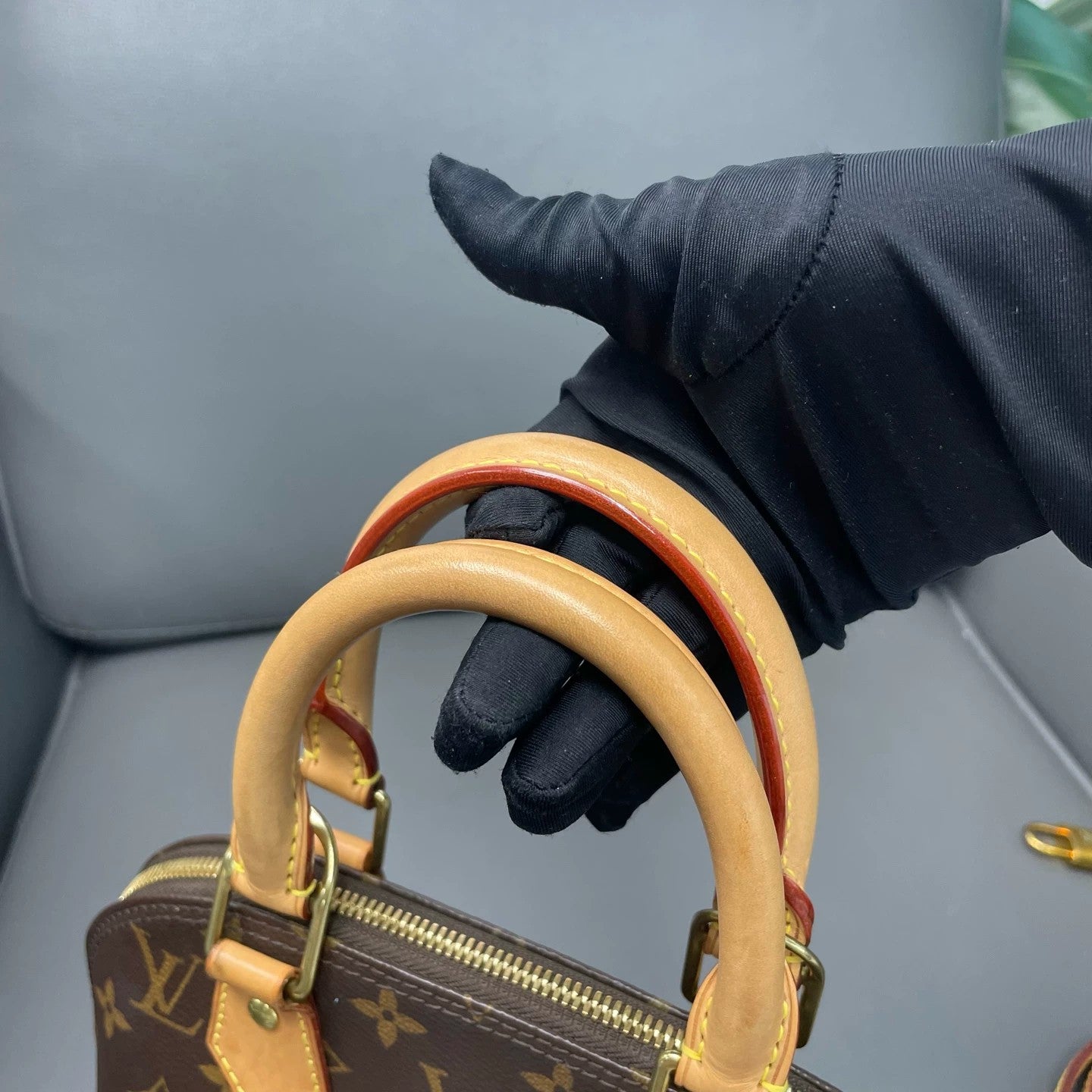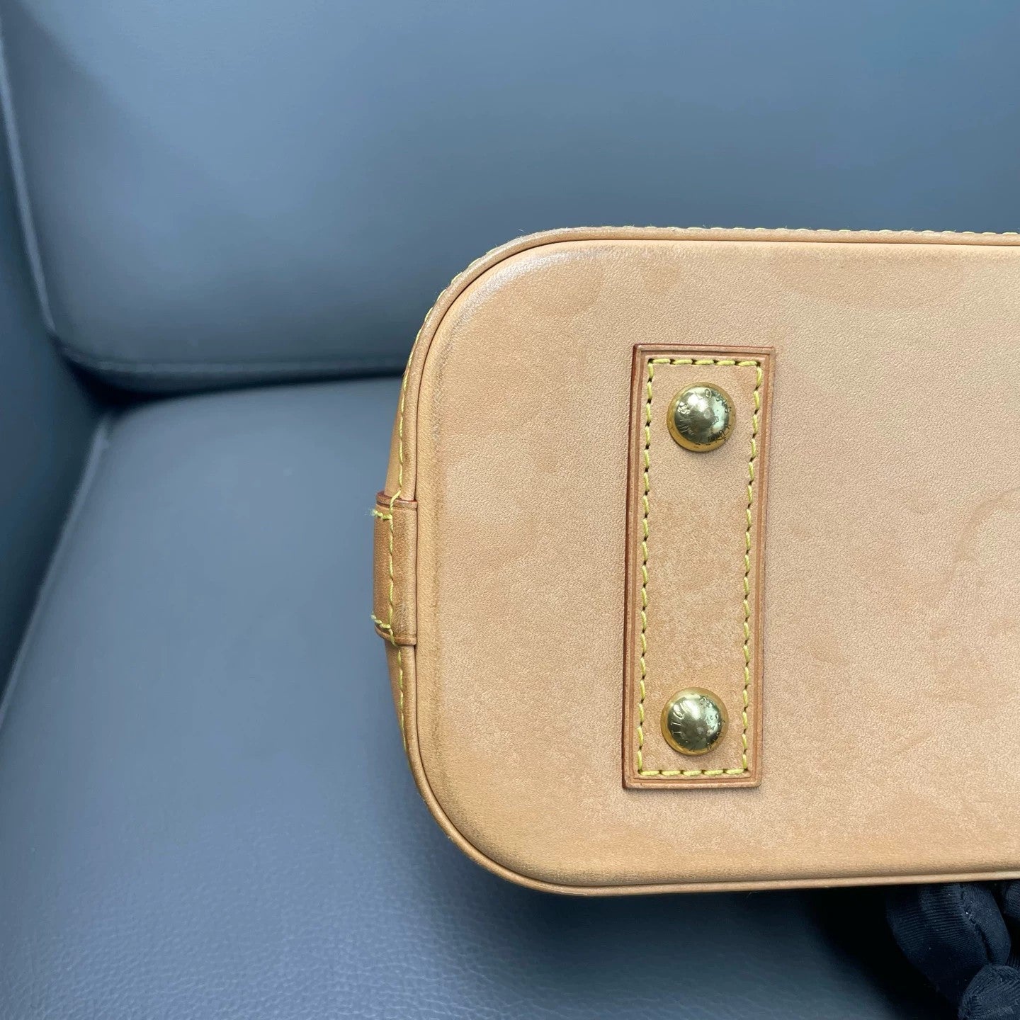 This Louis Vuitton Alma BB in Monogram canvas is in very good pre-owned condition, showing slight signs of use. The iconic Monogram canvas exterior remains vibrant and largely clean. The Vachetta leather trim, handles, and base have developed a lovely honey patina, consistent with gentle use, and show some minor water spots and surface wear. The gold-tone hardware is bright with minor surface scratches. The interior is clean with minimal signs of use.