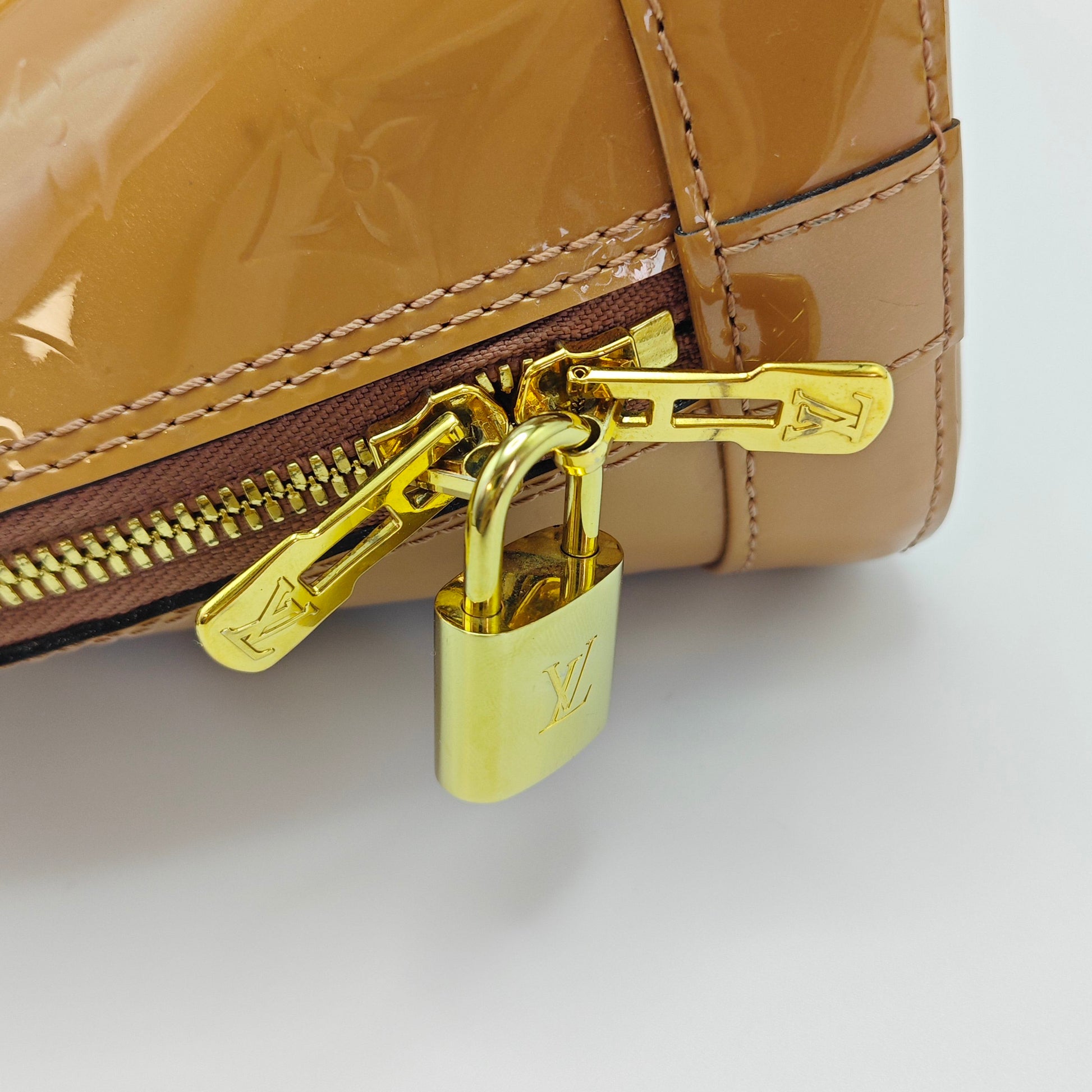 This Louis Vuitton Alma BB in Vernis patent leather presents in very good condition. The structured dome shape is well-maintained, and the glossy exterior shows minimal signs of wear with good color saturation. The gold-tone hardware, including the double zip pull, padlock, and strap clasps, is bright and functional with minor surface scratches consistent with gentle use. The interior lining is clean with no significant marks. The protective base feet are intact with slight signs of wear.