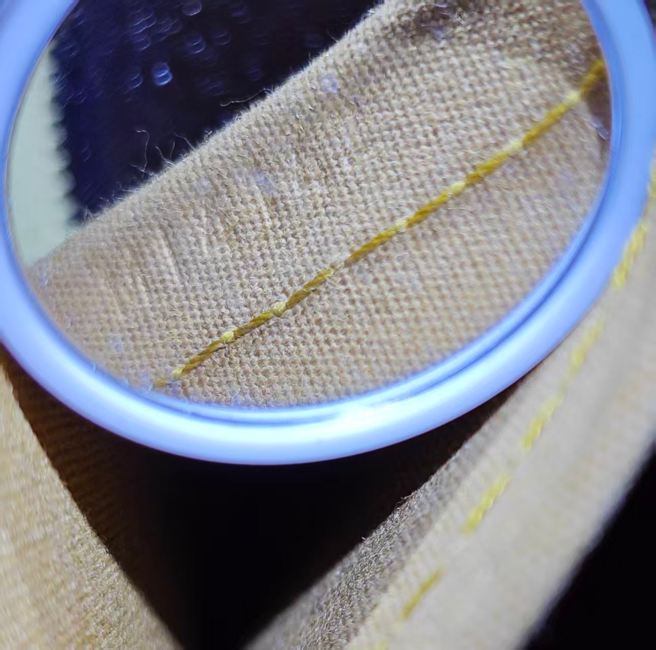The interior is lined with a tonal fabric in a light beige/tan hue, providing a clean contrast to the vibrant exterior. It includes one flat slip pocket, suitable for small essentials. The compartment is spacious for a mini bag, showing minimal signs of use and being free of significant stains or odors.