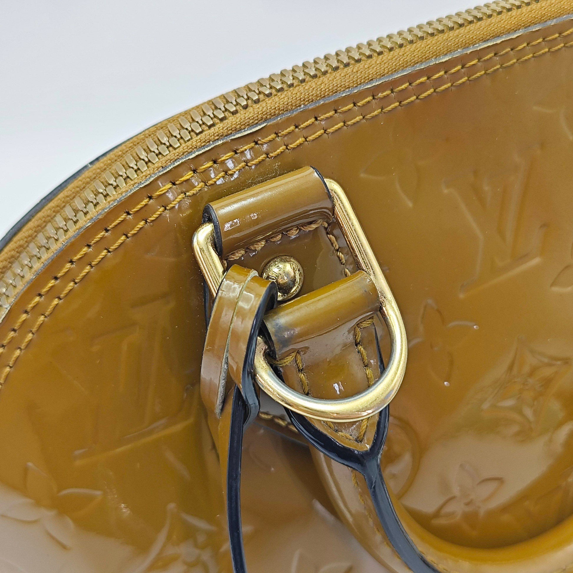 This Louis Vuitton Alma BB in mustard yellow patent leather is in good pre-owned condition. The glossy exterior retains much of its original shine, though some superficial scratches are visible, particularly on the side panels. The gold-tone hardware shows minor signs of use, consistent with gentle handling, but remains functional and bright. The interior lining is clean with minimal signs of wear. The bag maintains its iconic structured dome shape.