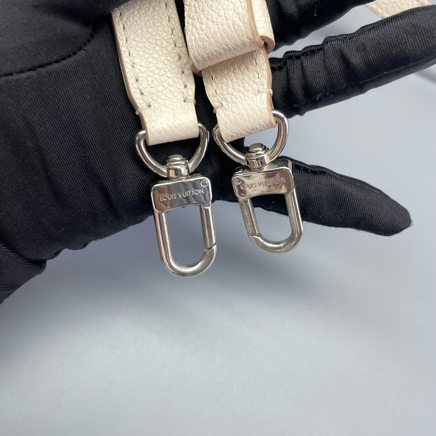 The bag is equipped with polished silver-tone hardware, including a prominent LV initial clasp closure on the front flap that functions smoothly. The detachable shoulder strap connects with sturdy silver-tone snap hooks, each engraved with 'LOUIS VUITTON', showing excellent functionality and minimal surface wear.