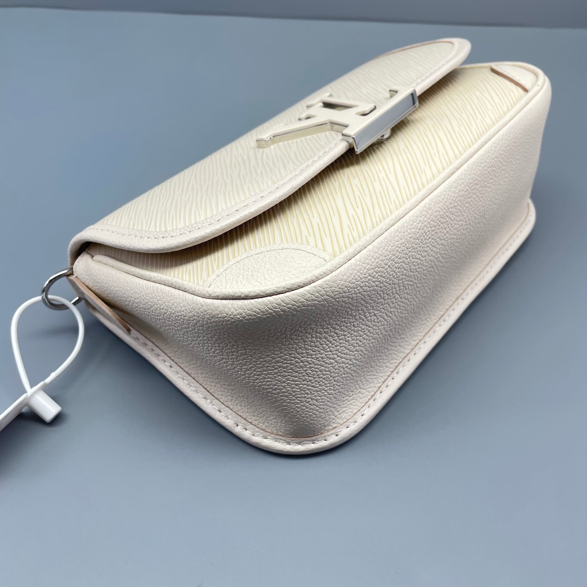 This pre-owned Louis Vuitton Baguette Shoulder Bag in white Epi leather is in very good condition, rated at 97%. The structured exterior retains its elegant shape with minimal signs of wear on the signature Epi leather. The silver-tone hardware, including the prominent LV logo on the flap and the strap clasps, is bright and shiny with only minor hairline scratches consistent with gentle use. The interior is clean and well-maintained, showing very little wear. The detachable shoulder strap is in excellent condition, ensuring versatile carrying options. This bag features an RFID chip for authenticity, typical of newer models.