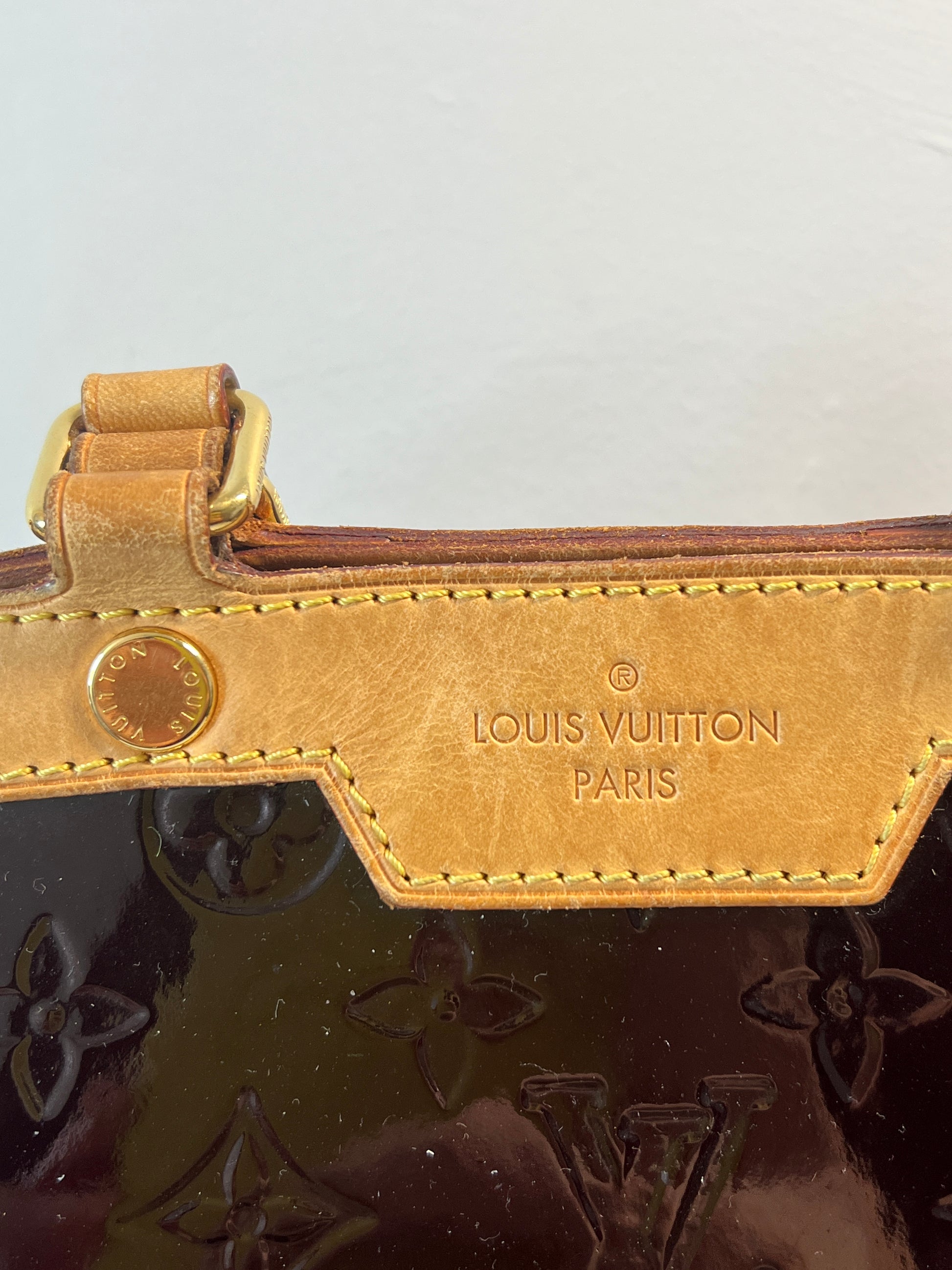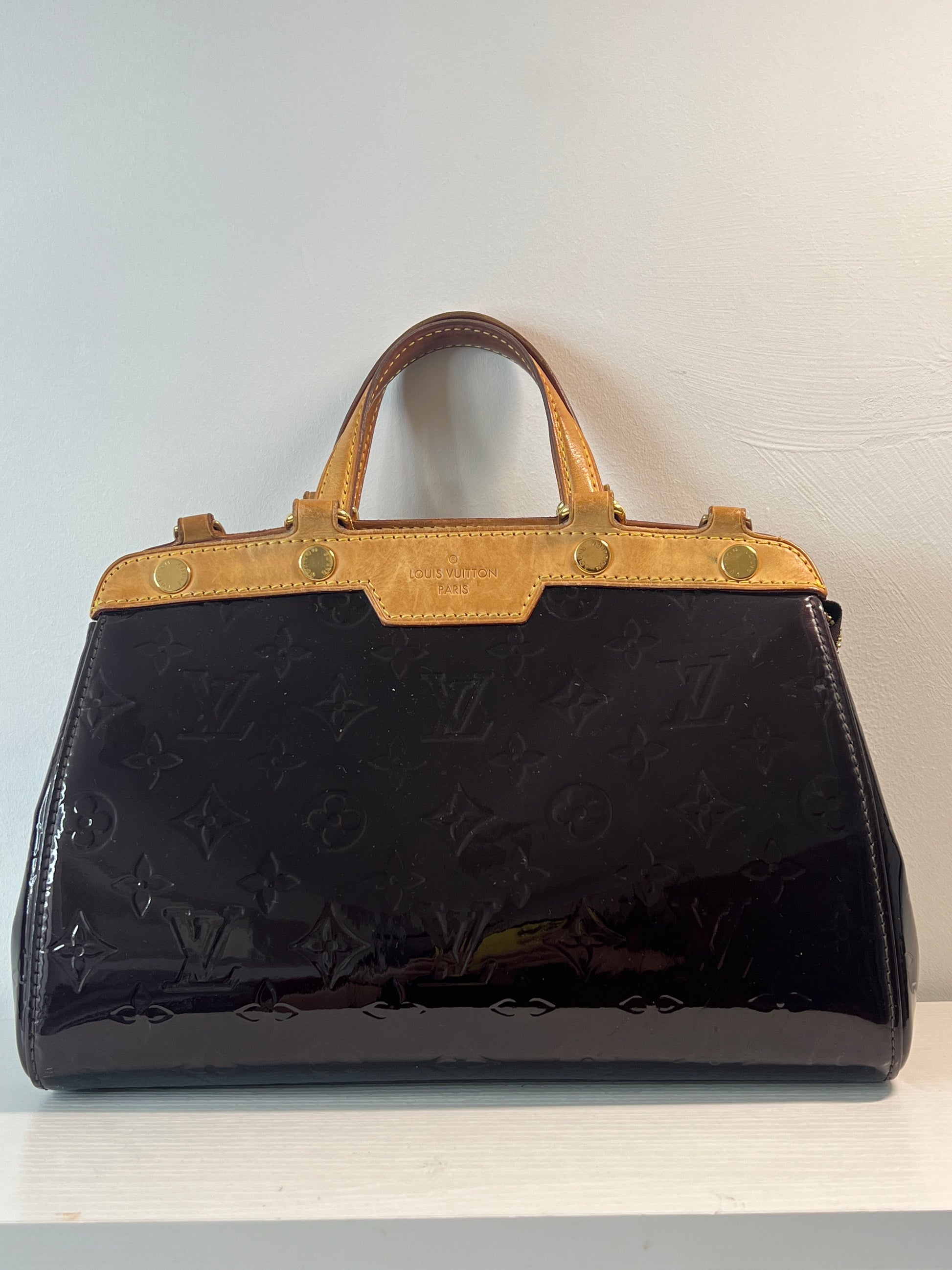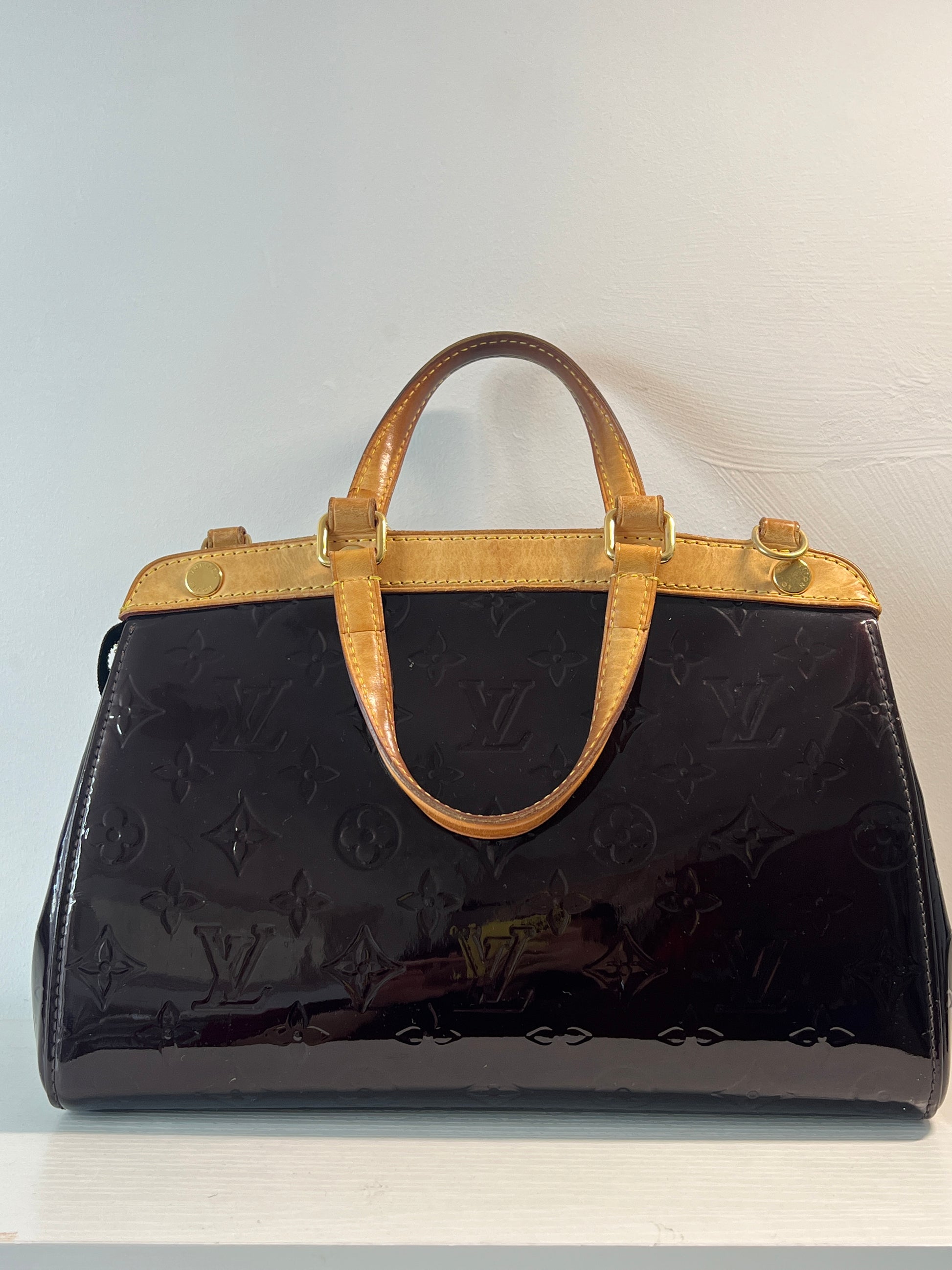Condition description: This Louis Vuitton Brea MM handbag is in good pre-owned condition. The exterior Monogram Vernis leather maintains its glossy finish and deep red hue, showing minor surface scuffs and faint marks consistent with gentle use. The Vachetta leather trim, top handles, and detachable shoulder strap have developed a rich honey patina, exhibiting some darkening and minor water marks, especially on the handles from regular contact. The gold-tone hardware shows light surface wear and some minor oxidation, but remains fully functional. The interior is clean with minimal signs of use, free from significant stains or odors.