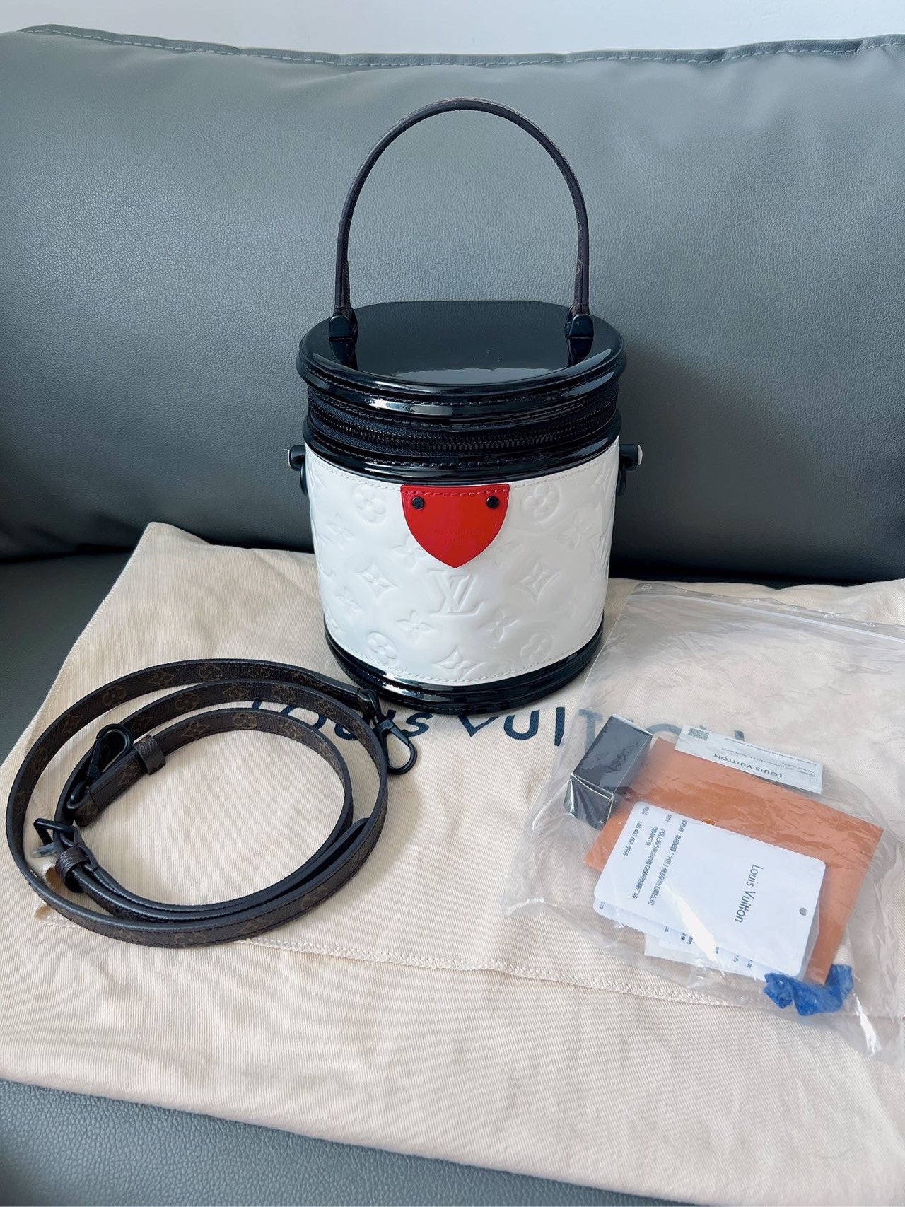 This piece stands out with its modern cylindrical silhouette, the elegant contrast between the matte embossed white monogram and glossy black patent leather, and the playful yet sophisticated red heart detail. The versatility provided by the top handle and adjustable shoulder strap makes it suitable for various occasions.