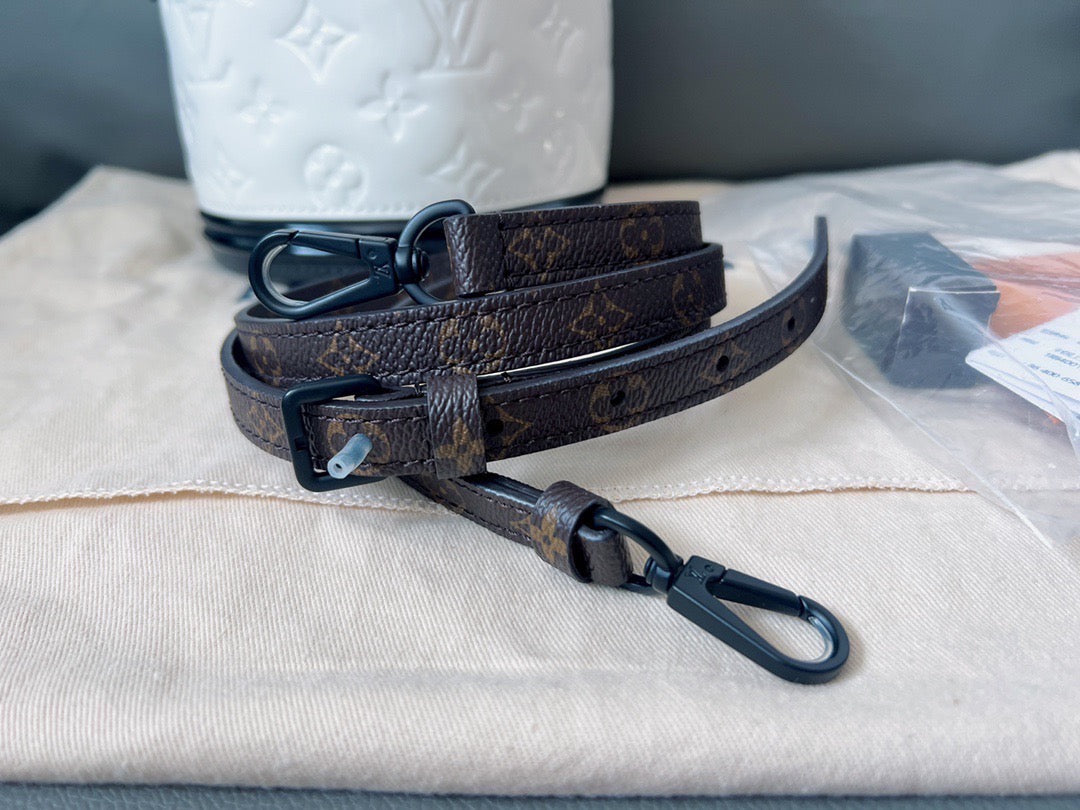 This Louis Vuitton Bucket Bag is in brand new, never worn condition. It is a '22 show style' item, indicating it's from a recent collection. The exterior materials are pristine, with no signs of wear, scuffs, scratches, or discoloration on the white embossed monogram leather or the black patent leather. All hardware is immaculate and fully functional. The interior is impeccably clean. The bag retains its original structure and shape perfectly.