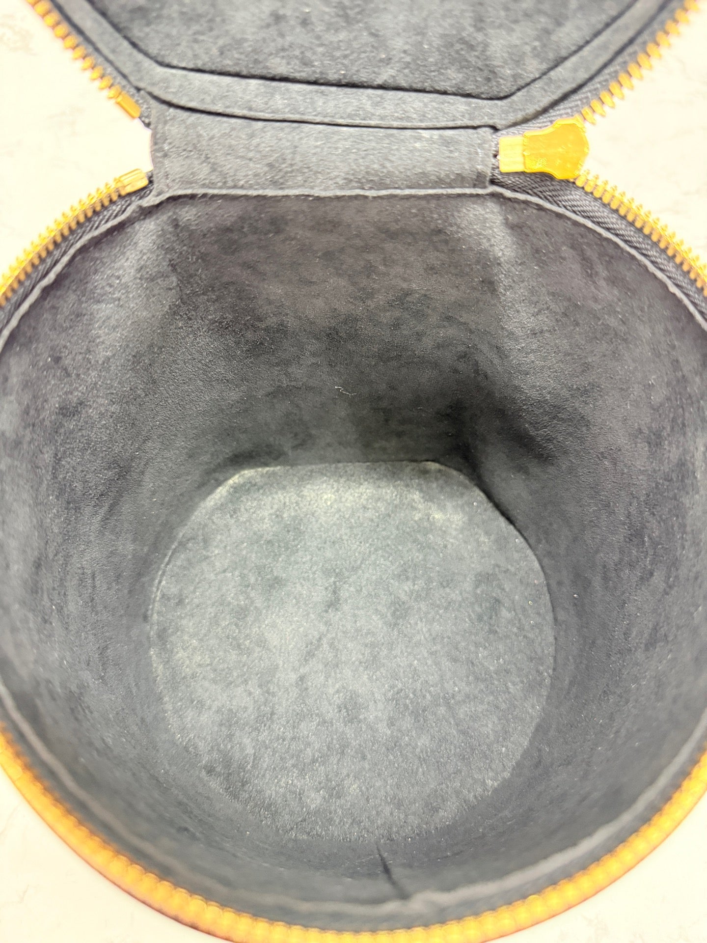 This Louis Vuitton Cannes bag, produced in 2020, is in very good pre-owned condition, reflecting its 95% new grade. The iconic Monogram coated canvas exterior is crisp and well-preserved with vibrant colors and minimal signs of wear. The black leather trim, including the top handle and base, shows light signs of use but remains supple. Gold-tone hardware, including the dual zippers, padlock, and protective base studs, is bright and shiny with only faint surface scratches consistent with gentle handling. The interior is clean with no significant marks or odors.
