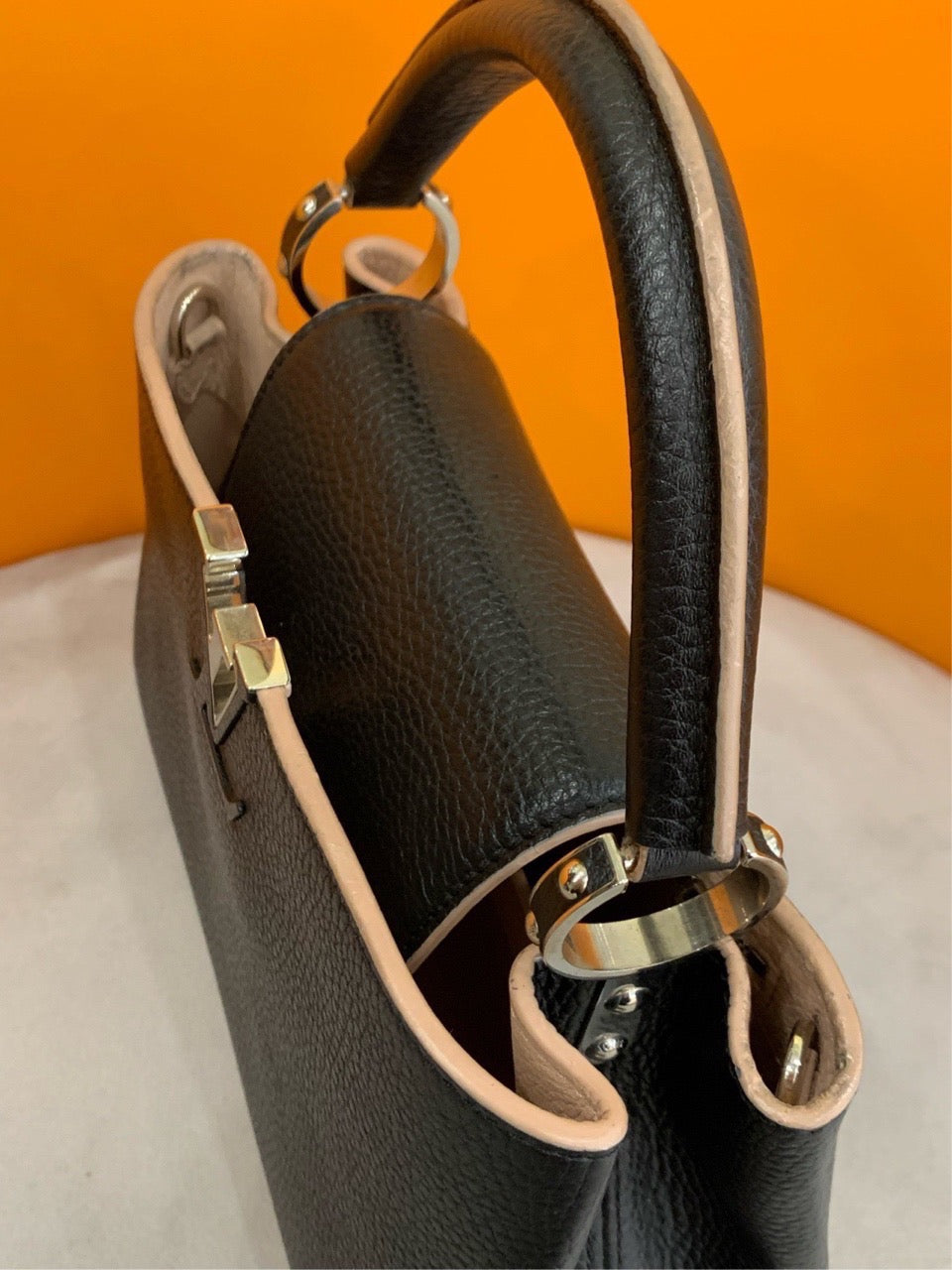 This Louis Vuitton Capucines BB handbag is in very good pre-owned condition, displaying minimal signs of wear consistent with careful use. The exterior Taurillon leather maintains its rich black color and distinct grain, with no significant scuffs, scratches, or discoloration. The structured silhouette is well-preserved. The hardware exhibits minor hairline scratches typical of light handling, but remains shiny and fully functional. The interior lining is clean with no visible stains or damage, and the overall integrity of the bag is excellent.
