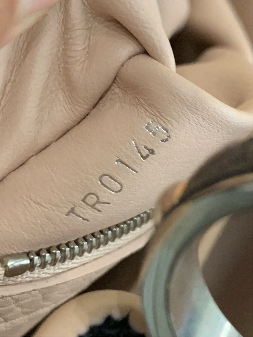 The interior is lined with a smooth, light beige leather, providing a subtle contrast to the black exterior. It features two main compartments, with a central zipped pocket and a flat pocket, offering practical organization for essentials. The interior is clean and shows no significant wear.
