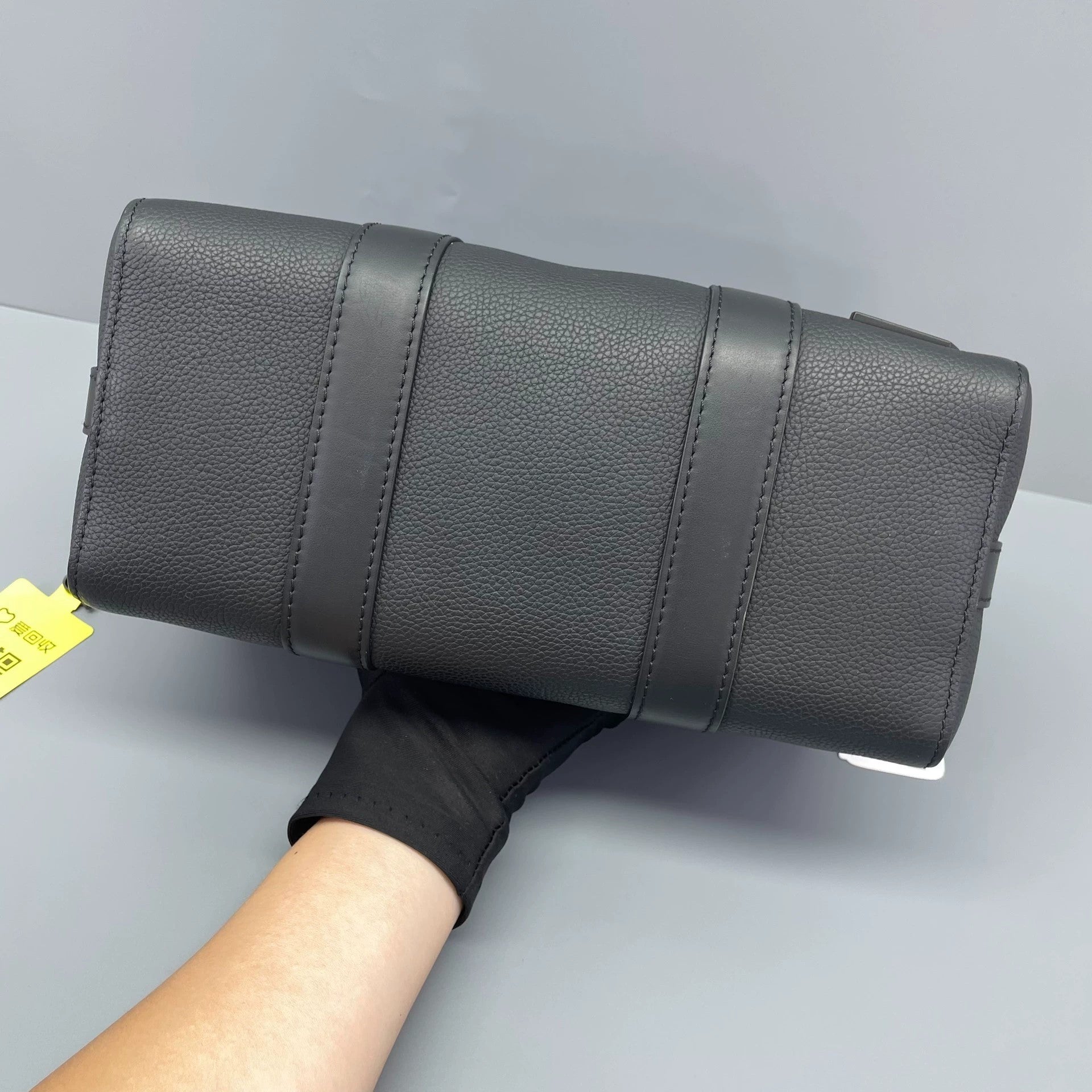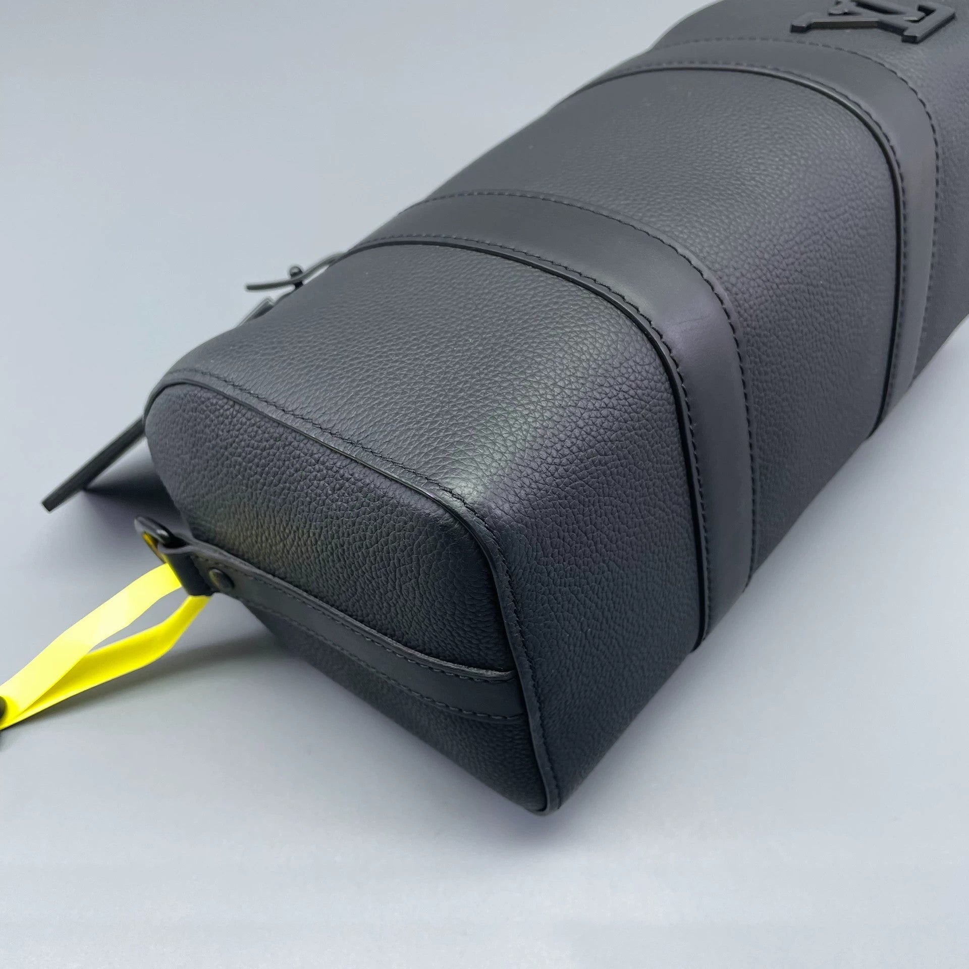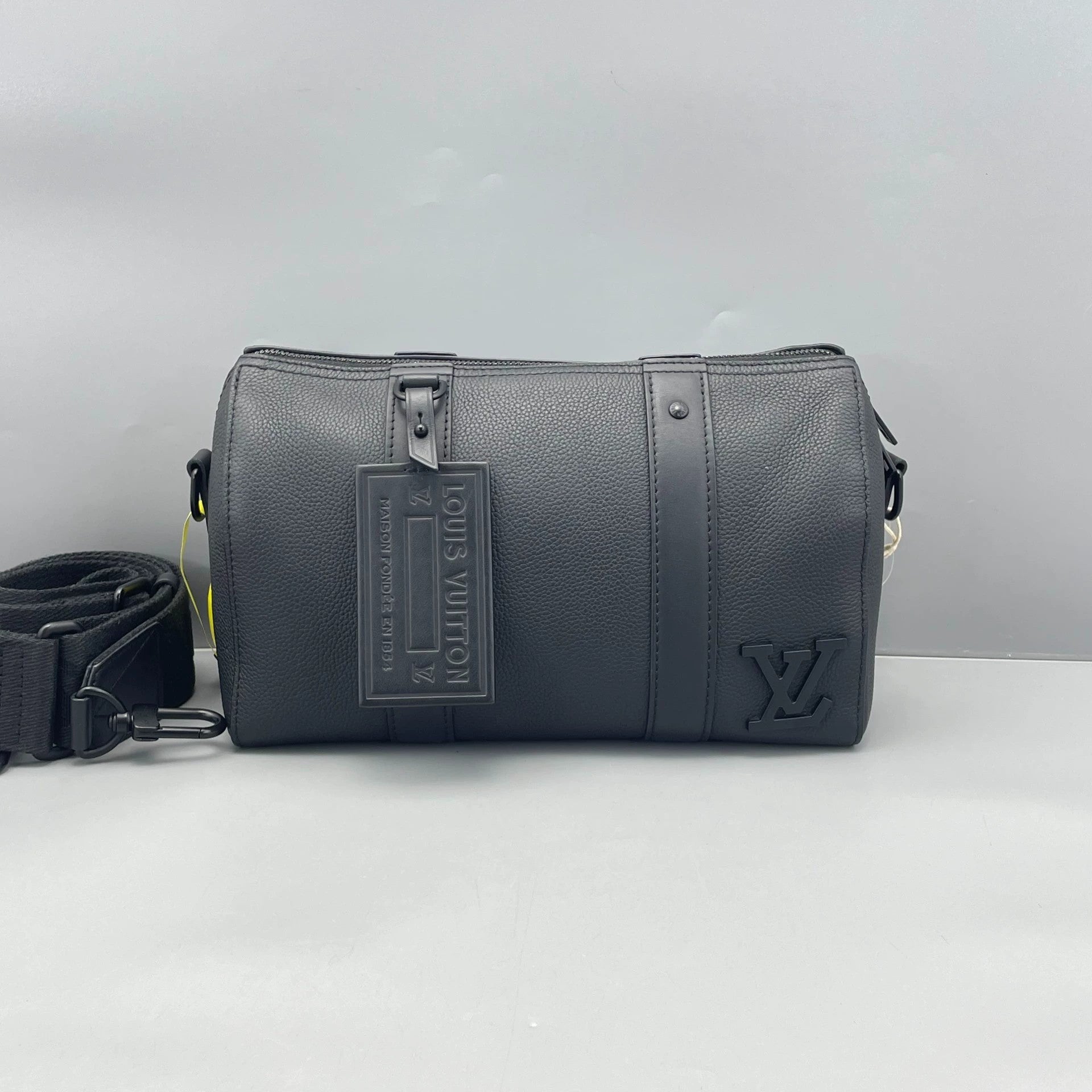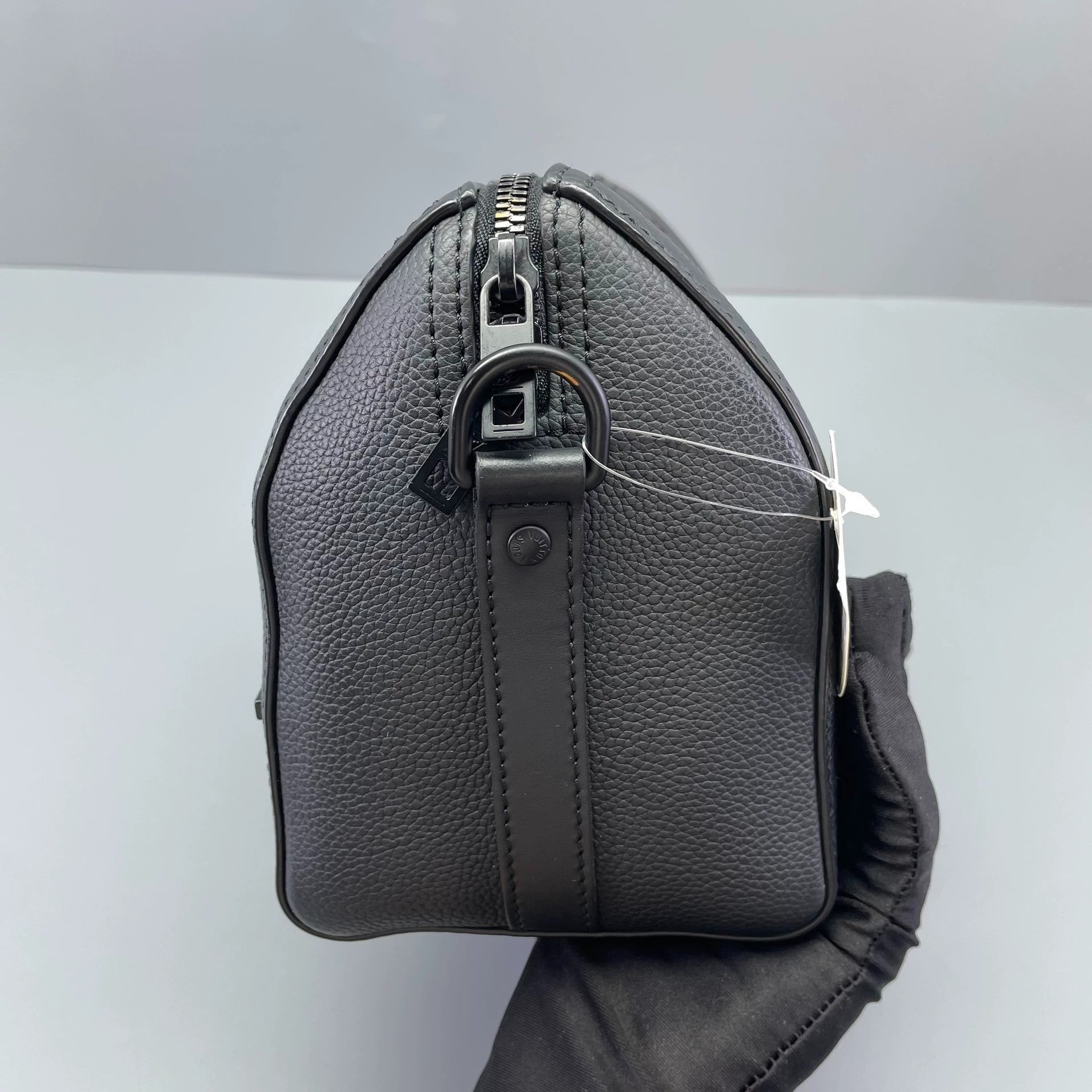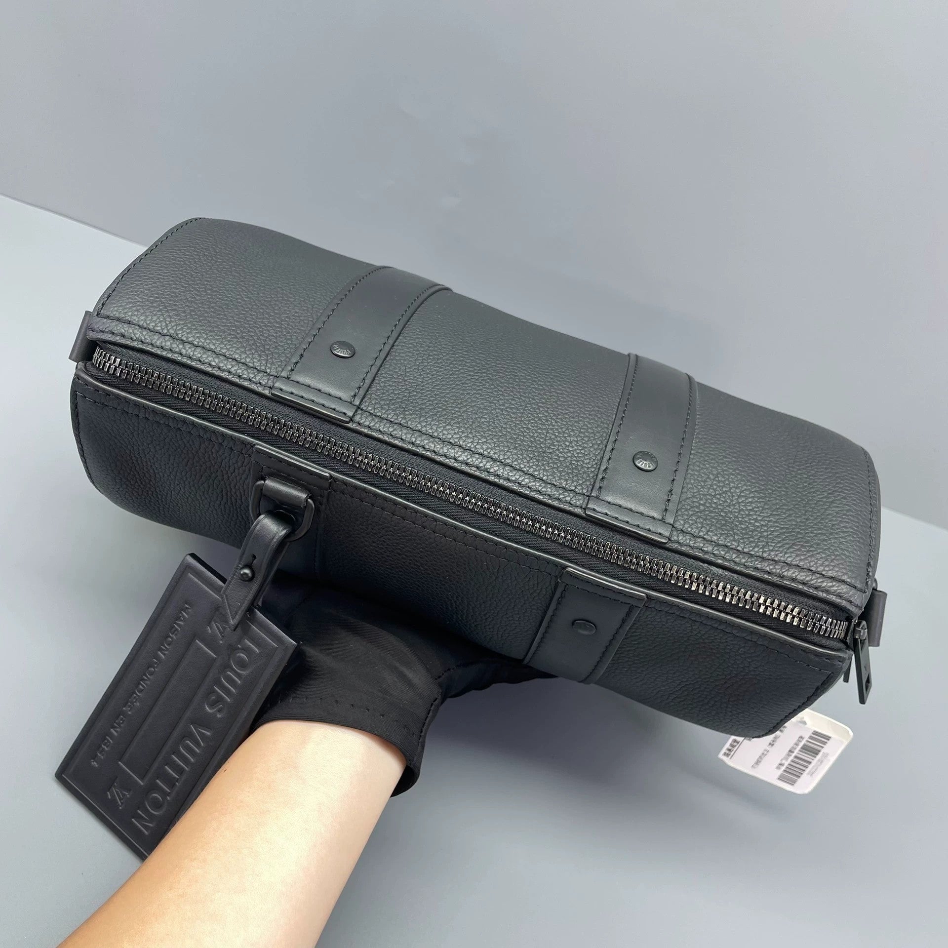 This Louis Vuitton City Keepall 27 is in almost new condition, rated 97% new. The exterior black grained leather shows virtually no signs of wear, maintaining its original texture and color. All hardware, including the matte black zipper and strap attachments, is intact and fully functional with no visible scratches or tarnishing. The interior is exceptionally clean, free from any stains, odors, or damage. The overall structure of the bag is firm and well-preserved.