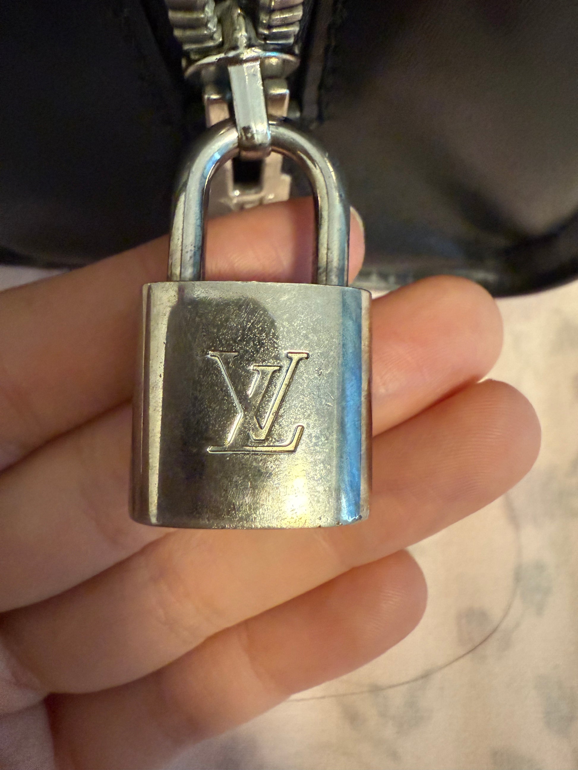 All hardware is silver-tone, including the D-rings securing the handles, the zipper pull, and the removable padlock. The zipper operates smoothly. The padlock bears the signature LV logo and shows minor surface scratches and slight dulling. A leather clochette is also present, which typically holds the keys for the padlock (keys not explicitly shown).