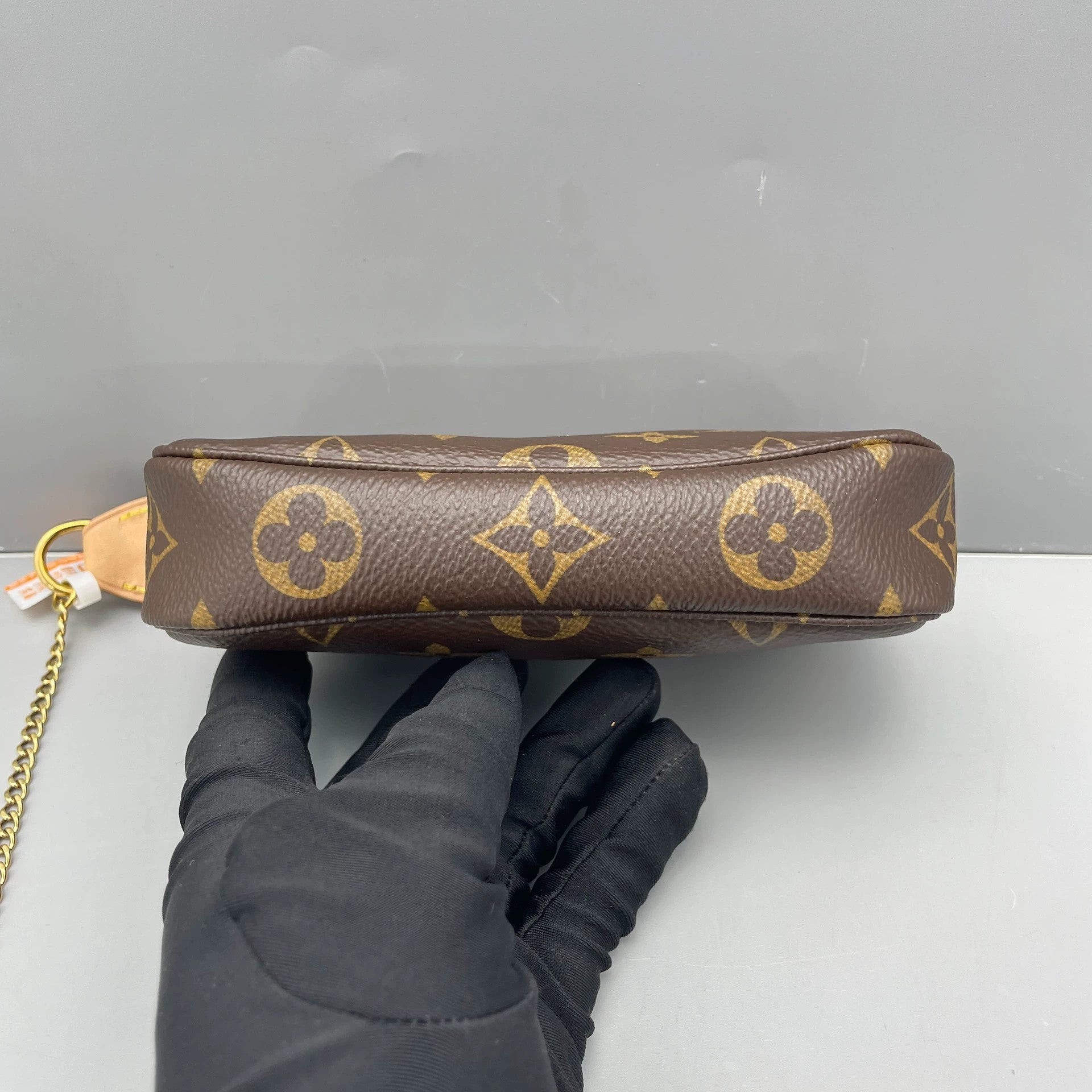 This Louis Vuitton Mini Pochette Accessoires in Monogram Canvas is in almost new condition, rated 98% new. The exterior Monogram canvas is vibrant and shows no visible wear, scuffs, or marks. The natural cowhide leather trim and wrist strap show minimal to no signs of patina or wear. The gold-tone hardware is bright and shiny with no noticeable scratches or tarnishing. The interior textile lining is clean and free from any stains or odors.