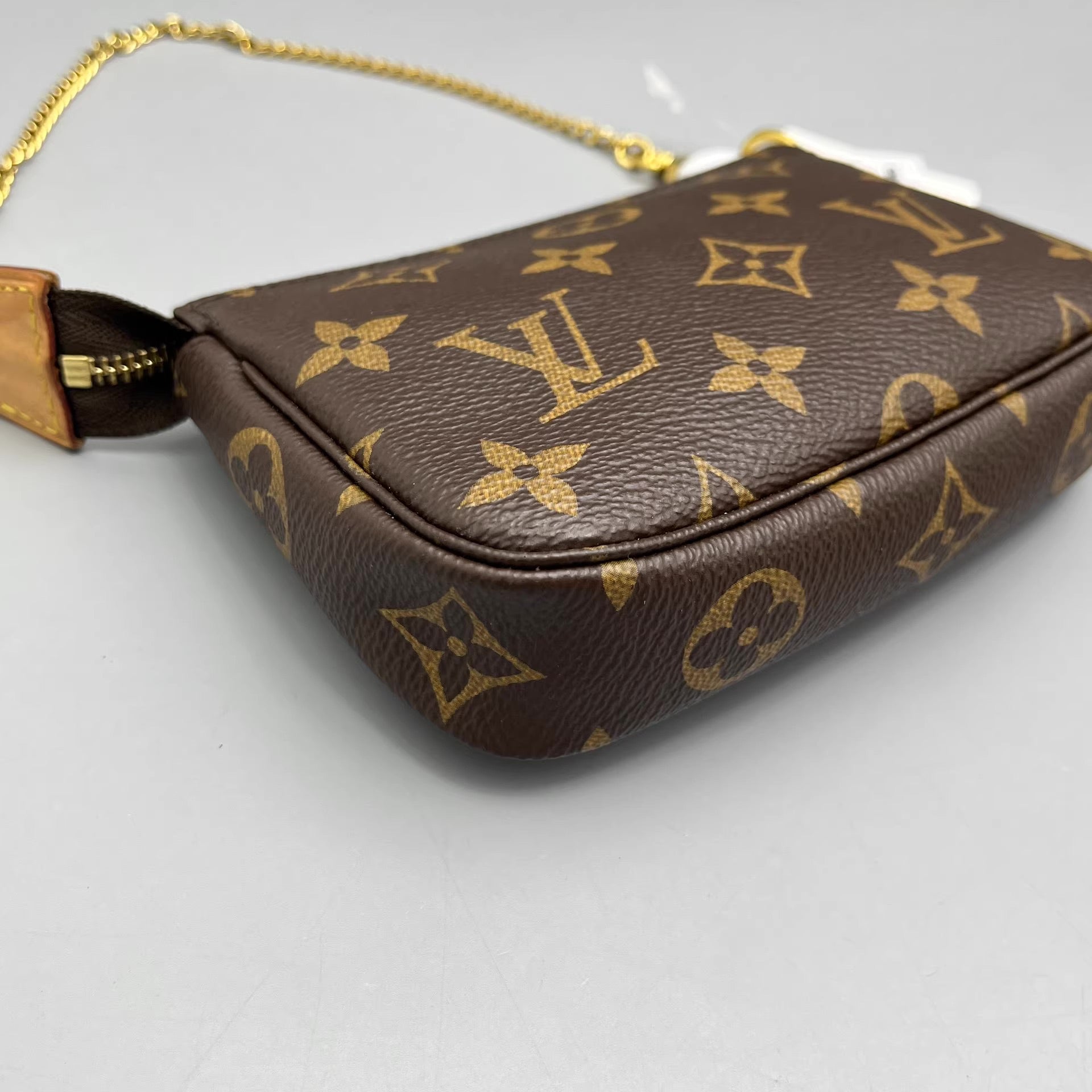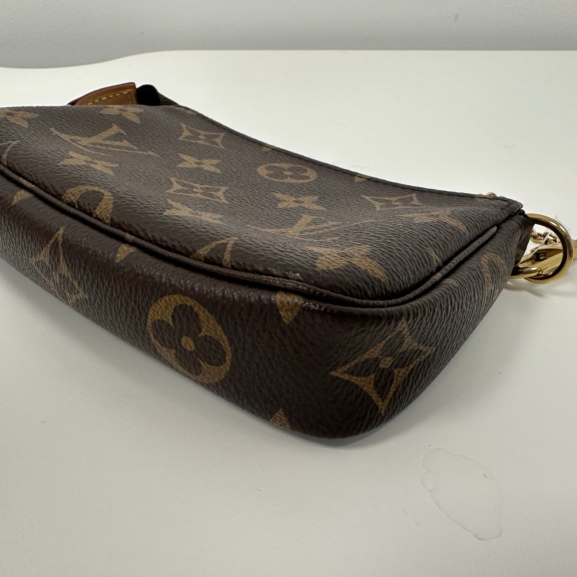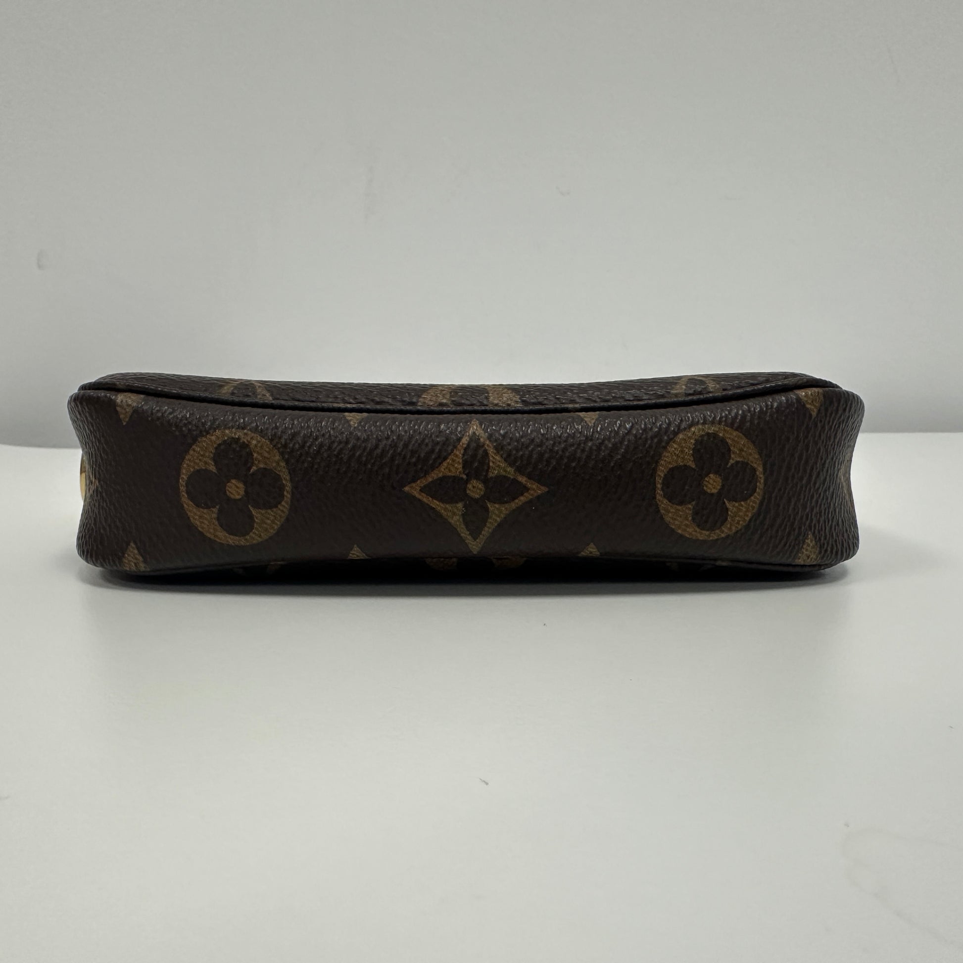This Louis Vuitton Mini Pochette Accessoires, produced in 2022, is in excellent pre-owned condition, rated at 98%. The iconic Monogram coated canvas exterior is vibrant and shows minimal signs of wear, free from significant scuffs or marks. The natural vachetta leather tab has developed a very light, even honey patina, consistent with gentle use and age. The gold-tone hardware, including the zip pull and chain, retains much of its original shine but exhibits some minor hairline scratches and slight tarnishing on the zip pull. The interior lining is clean with no visible stains, tears, or odors, indicating careful ownership.