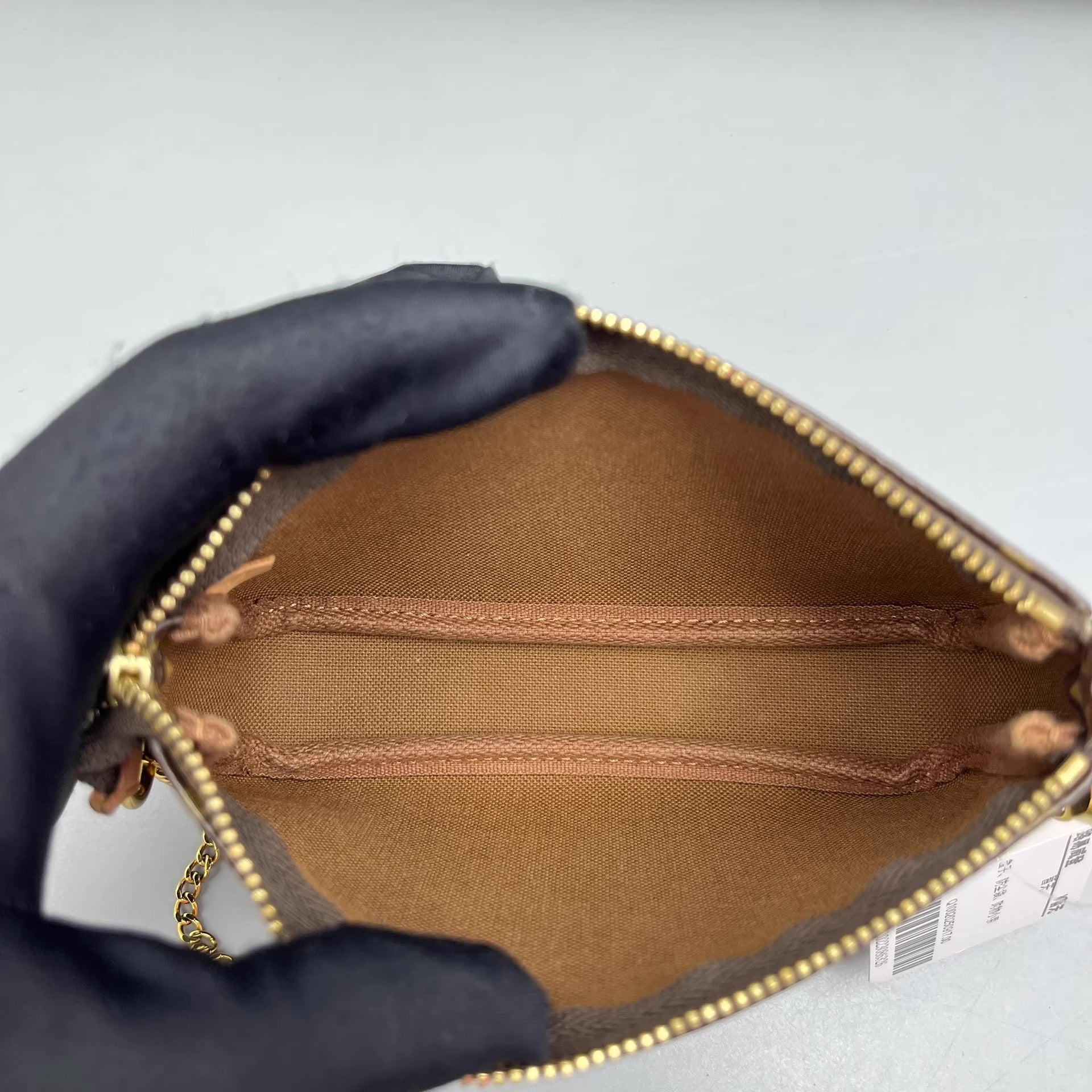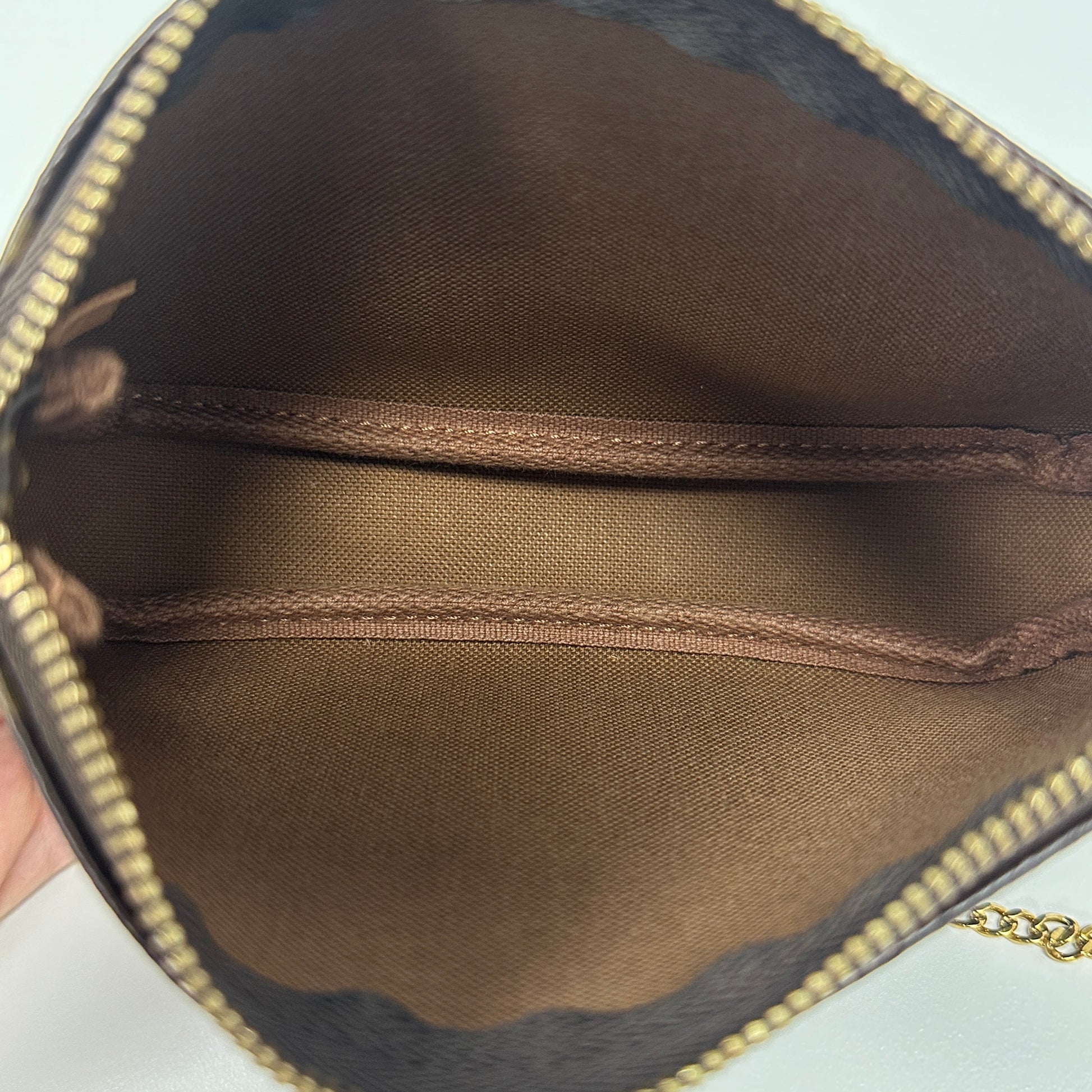 The Mini Pochette Accessoires is a highly versatile and popular accessory, perfect for organizing items within a larger bag or carrying independently as a small clutch or wristlet. Its detachable chain provides flexibility in styling, and the timeless Monogram pattern ensures lasting appeal. The recent production year of 2022 adds to its desirability.
