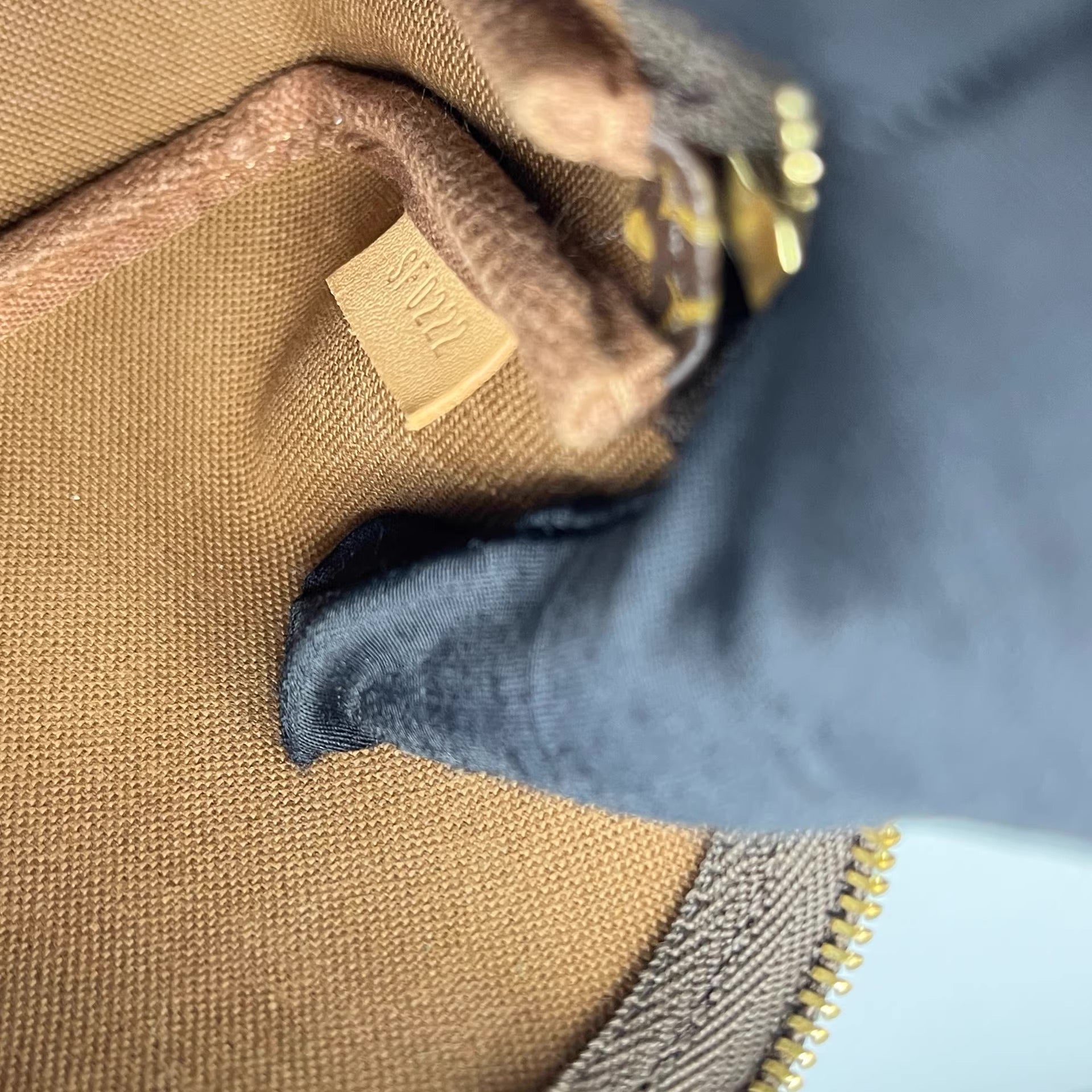 The exterior is crafted from durable Louis Vuitton Monogram coated canvas, featuring the iconic interlocking LV initials, quatrefoils, and flowers in a rich brown hue. The textured canvas maintains its structural integrity and remains free from significant creasing or rubbing. The compact, rounded silhouette is well-preserved, with neatly finished edges and corners. A small tab of natural vachetta leather is present at one end of the zipper, showing a subtle, even tan from light exposure.