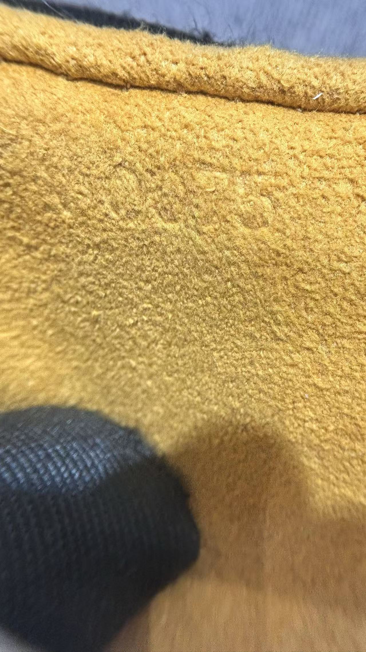 The interior is lined with a soft, clean yellow (likely Alcantara or microfiber) material. It is free from cracking or significant wear, offering a well-maintained compartment for essentials. A small leather brand tag 'LOUIS VUITTON PARIS made in France' is present.