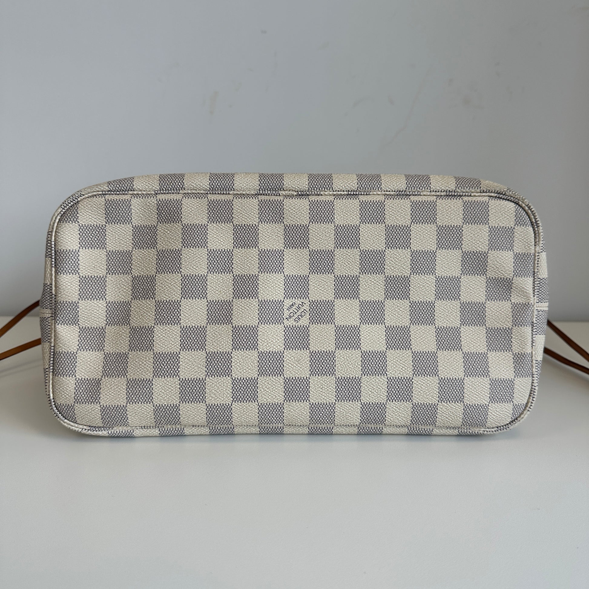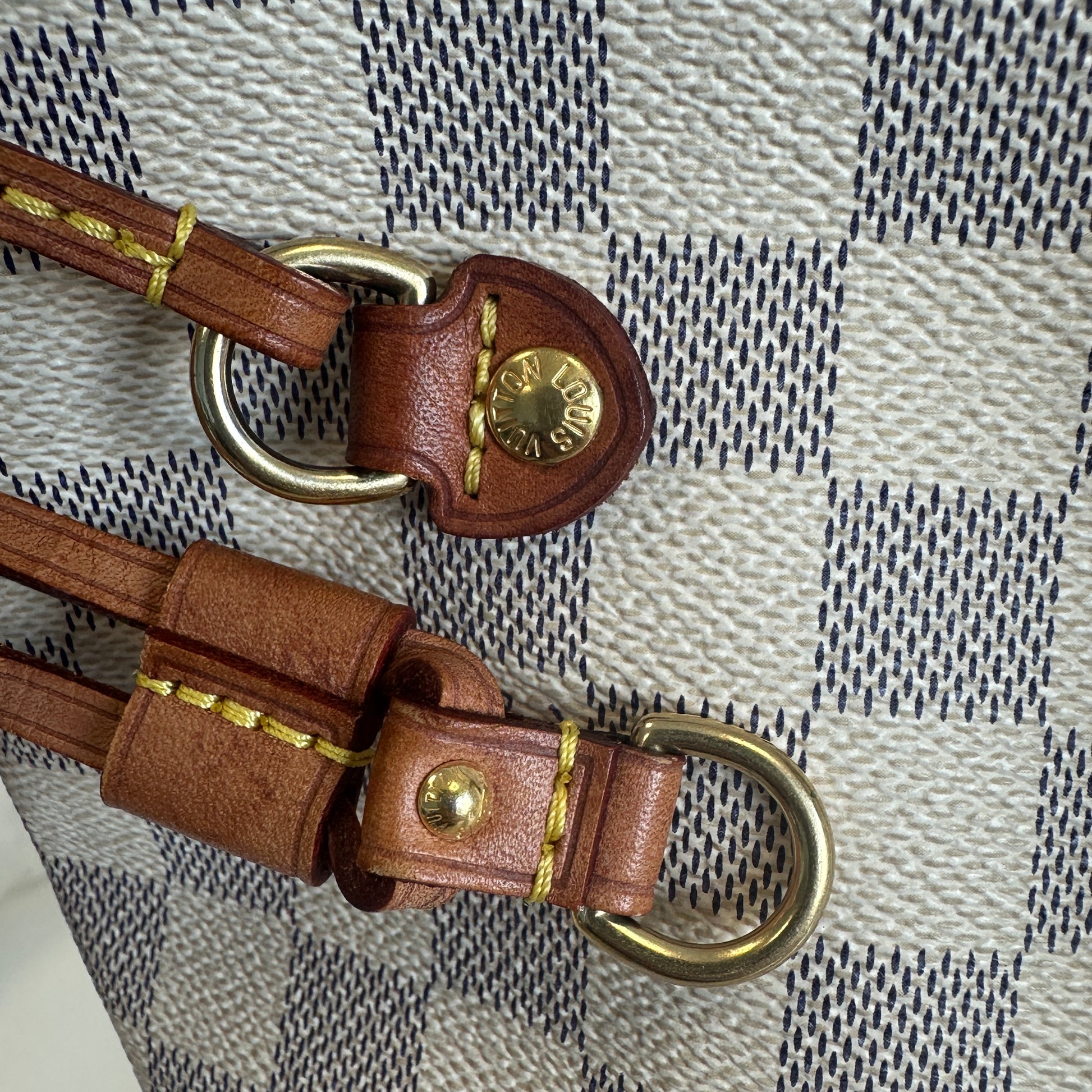 This Louis Vuitton Neverfull GM in Damier Azur canvas is in good pre-owned condition, reflecting regular use. The Damier Azur coated canvas exterior maintains its structure and vibrant pattern, showing only minor signs of wear typical of its age. The Vachetta leather trim, including the top piping, handles, and side laces, has developed a rich honey patina, with visible darkening and some surface wear or slight watermarks, particularly on the handles and where the bag folds. The interior lining of the main compartment shows notable staining and discoloration at the bottom. Hardware components remain functional, exhibiting some signs of superficial scratches and minor tarnishing consistent with use. The removable pouch is included and appears in better internal condition.