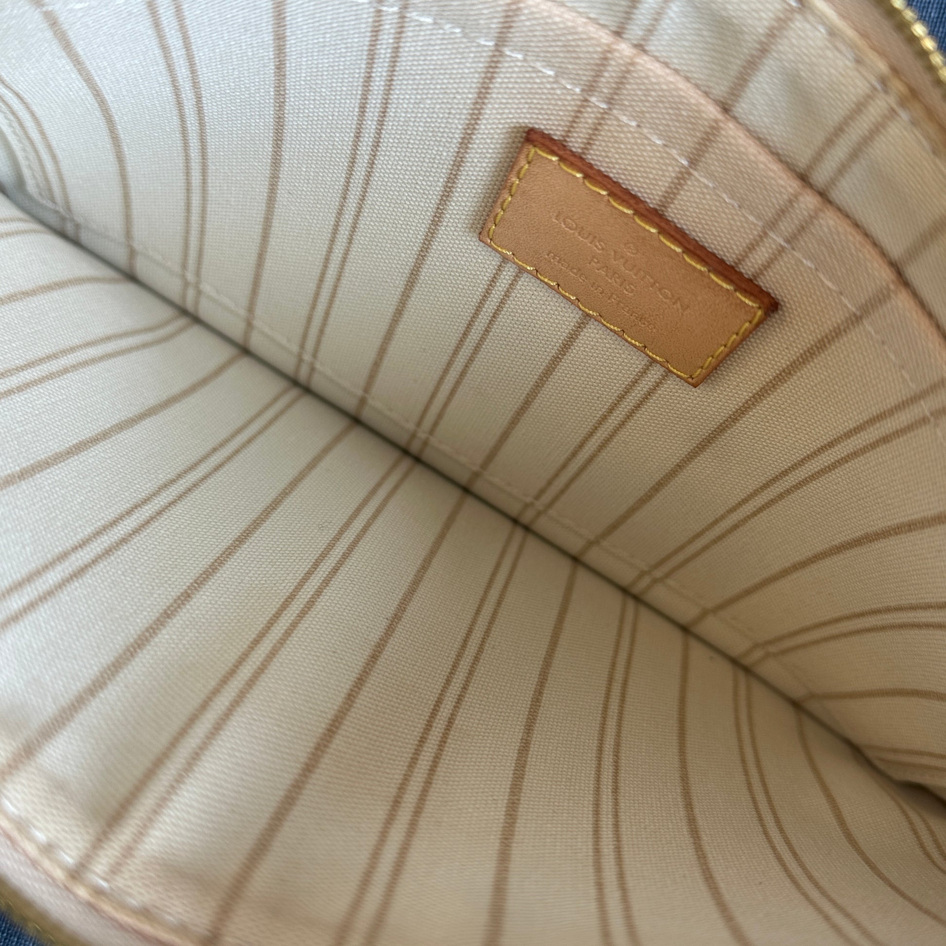 The interior of the main compartment is lined with a beige striped canvas, which shows significant dark staining and discoloration on the bottom. The interior zippered pocket, featuring the 'LOUIS VUITTON' leather patch, appears cleaner. The removable pouch also has a striped canvas lining and appears to be in better internal condition.