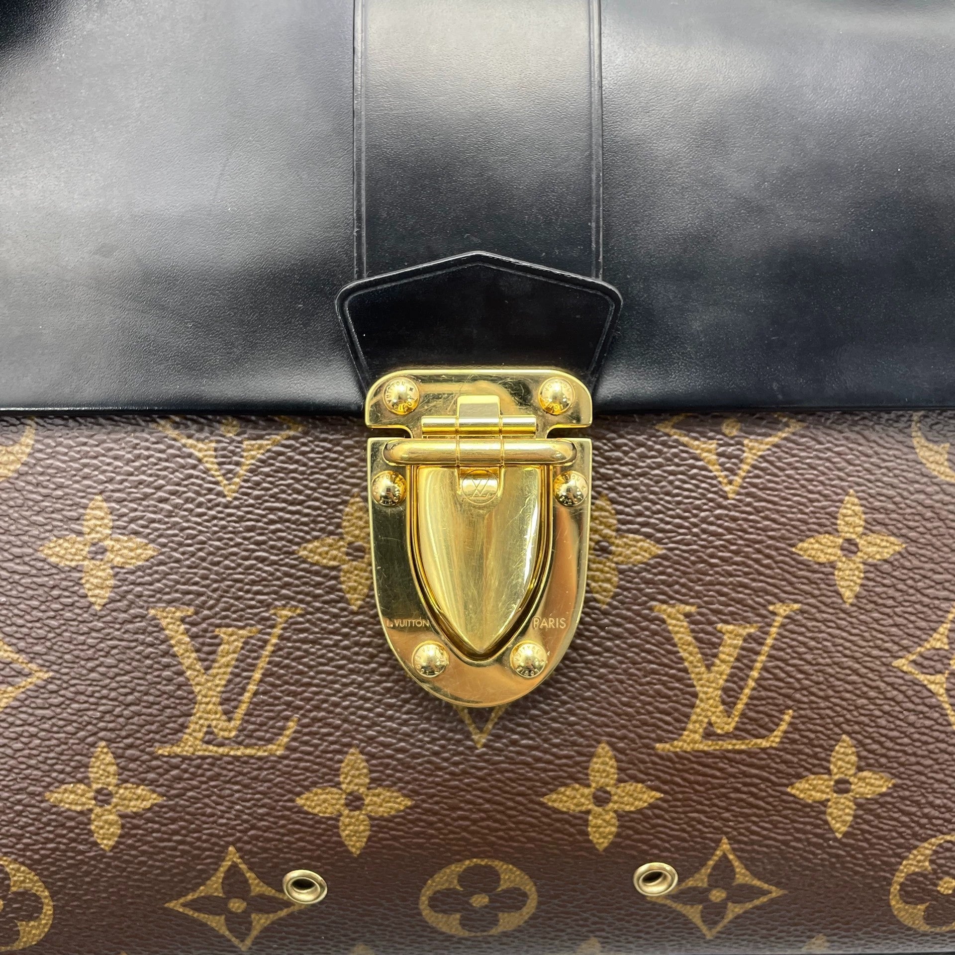 The bag features a structured design crafted from Louis Vuitton's signature Monogram canvas, complemented by a smooth black leather flap, top handle, and side detailing. The Monogram canvas exhibits a rich brown hue with the classic LV initials, quatrefoils, and flowers. The black leather components are supple and maintain their original finish. The base is protected by four gold-tone studs.