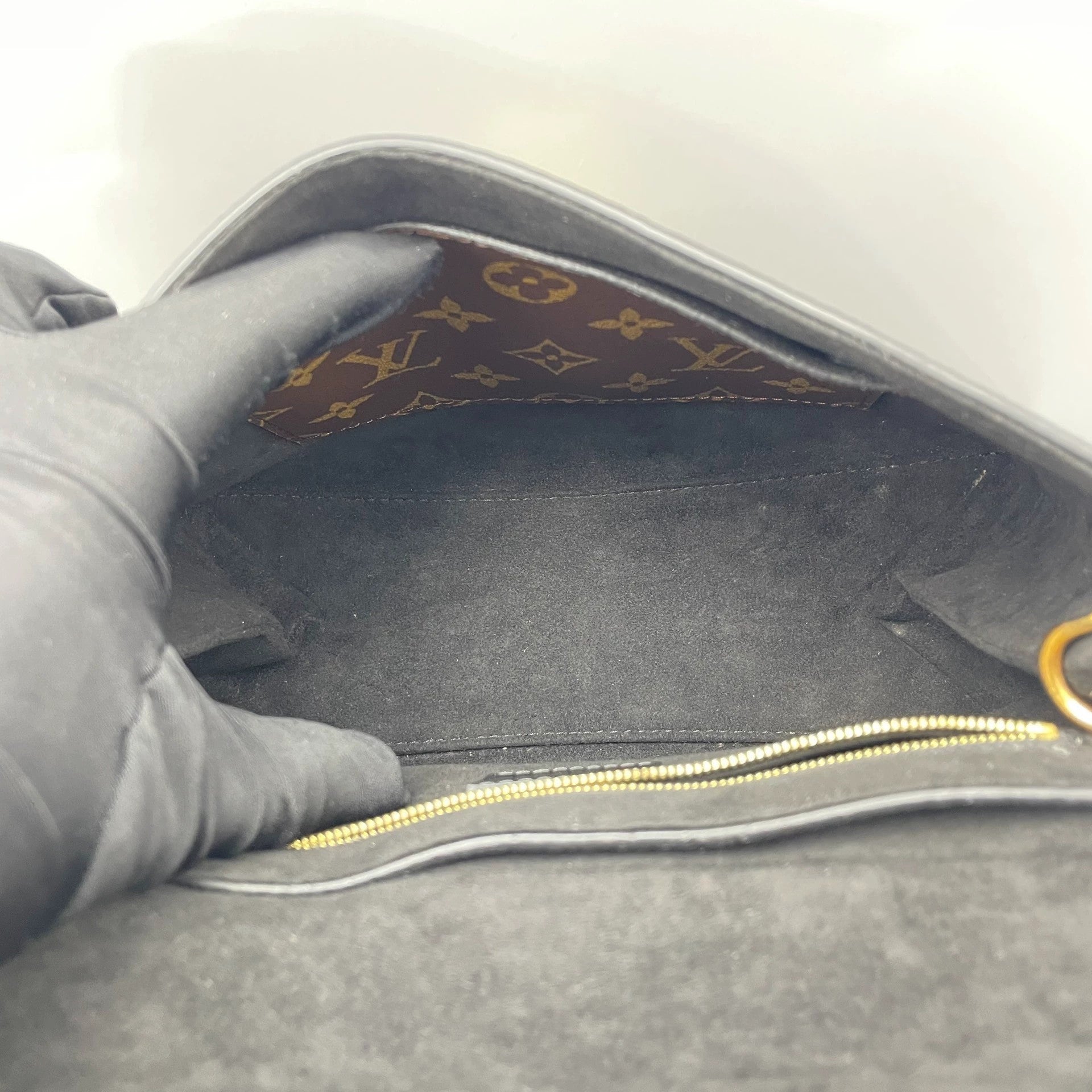 The interior is lined with a soft, black microfibre material, offering a luxurious feel. It is clean and free from significant marks or odors. The main compartment is spacious, and it includes a flat slip pocket for organization, featuring a partial Monogram canvas lining.