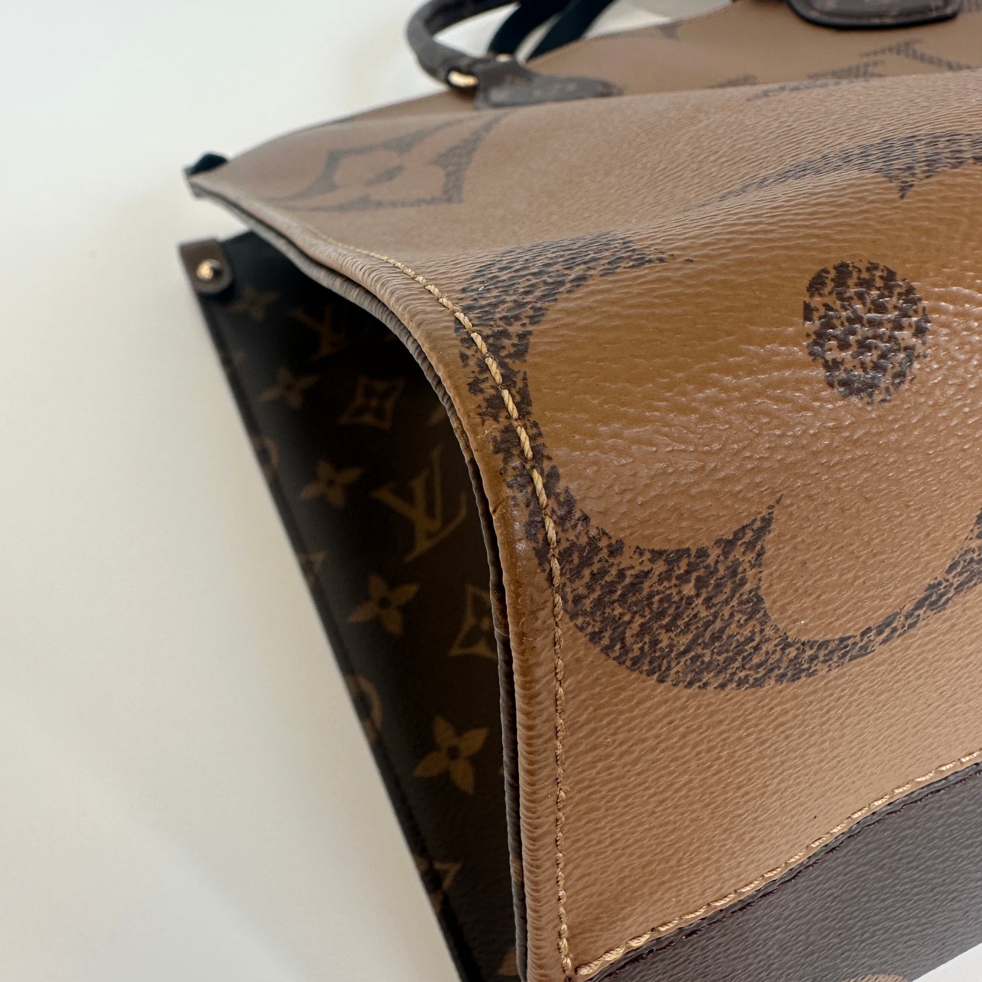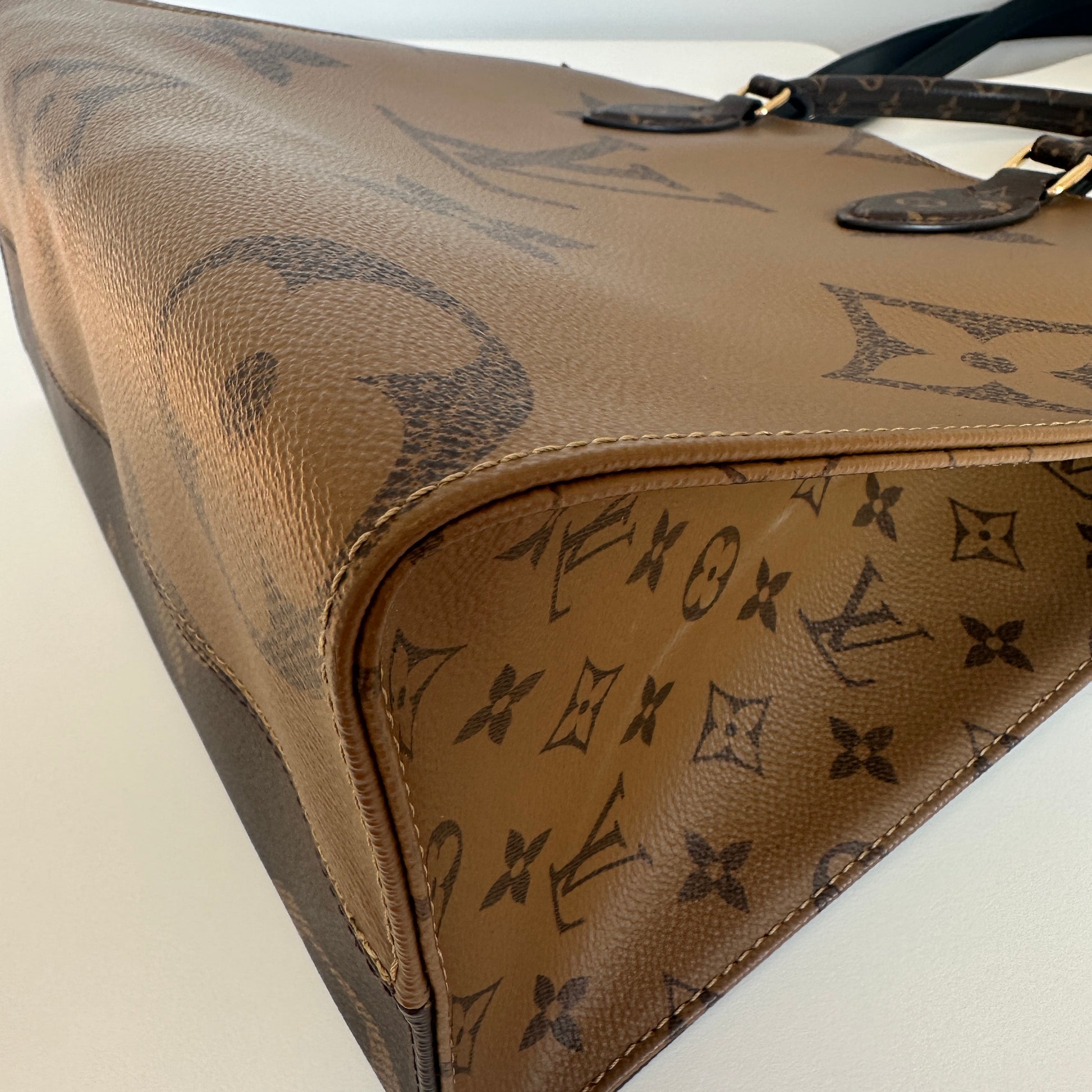 The exterior features Louis Vuitton's iconic Monogram Giant coated canvas, showcasing a striking blend of classic and enlarged monogram motifs in varying shades of brown and tan across its front, back, and side panels. The bag is designed to be reversible, presenting a different aesthetic on each major side. The top handles are crafted from black leather, while the shorter top handles are in monogram canvas. The leather trim and corners exhibit some wear and signs of the noted edge glazing repair.